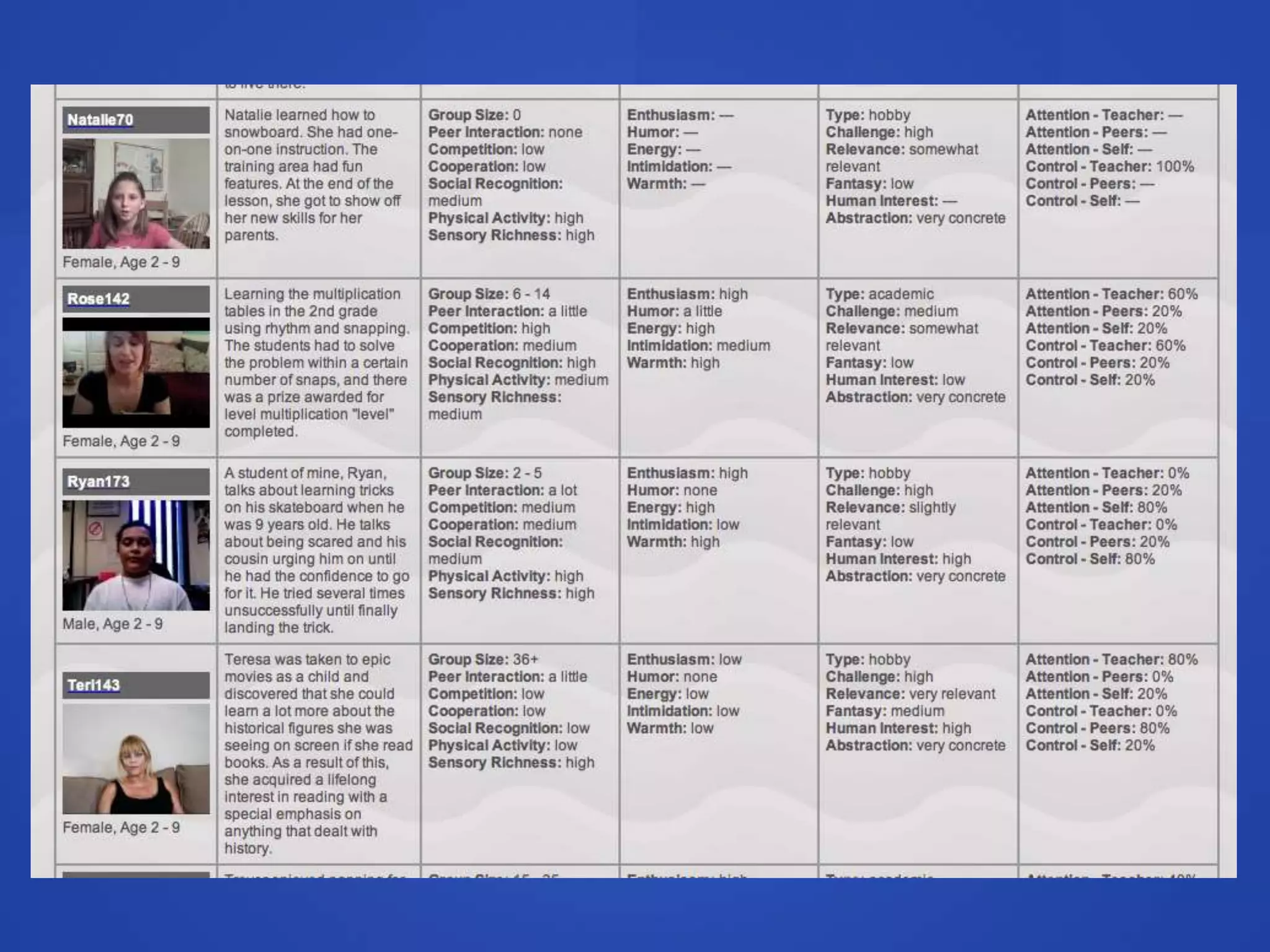 The document discusses the concept of engagement in learning, highlighting key attributes and methods of encouraging active participation among students. It shares insights from various individuals on what engagement looks like and contrasts engaging learning experiences with less interactive ones. Additionally, the document emphasizes the importance of interaction and hands-on activities while being cautious about over-relying on technology in education.