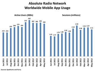 The document contains data on app installs, usage, registrations, and online activity for Absolute Radio Network from 2009 to 2012. It shows: