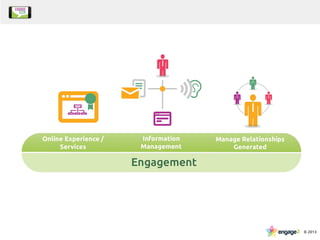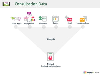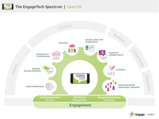 The document outlines various digital engagement tools and strategies that can be used to meaningfully engage with communities and stakeholders. Some of the tools mentioned include using social media, surveys, and analytics to monitor sentiment, gather feedback, share information, and encourage participation. Other tools discussed are games, maps, and collaboration platforms to explore ideas, represent information visually, and develop solutions together online.