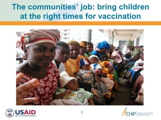 1) The document discusses a project in Timor-Leste that partnered with communities to improve vaccination rates by sharing responsibility between health services and communities.