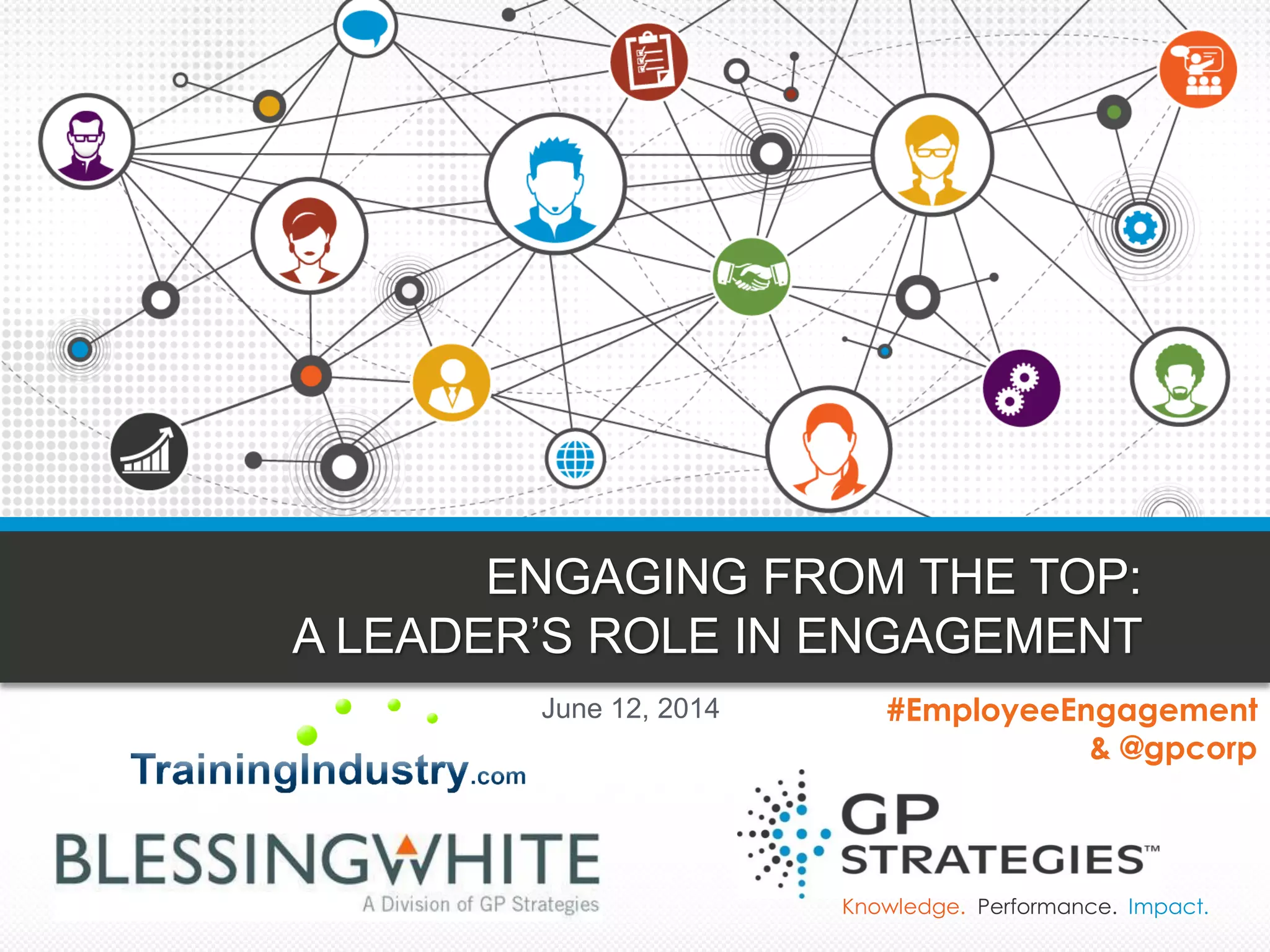 The document discusses the critical role of leaders in fostering employee engagement, highlighting the correlation between engagement and business performance. It emphasizes actionable strategies for leaders, such as commitment to engagement, clear communication, and alignment with organizational goals. Additionally, it notes the importance of personal connection and authenticity in leadership to inspire higher levels of engagement and performance.