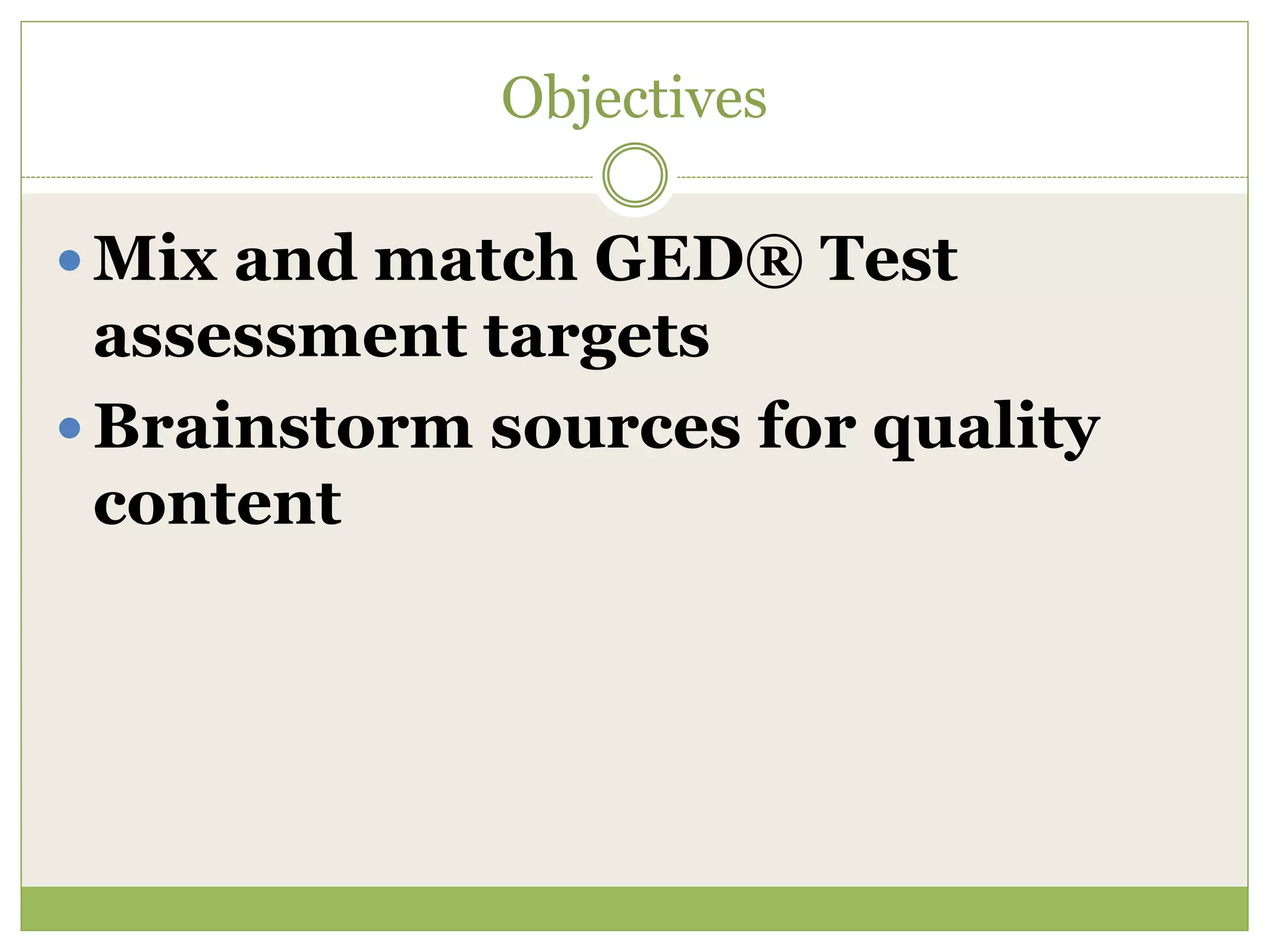 This document provides an overview of objectives and best practices for GED test preparation instruction. It discusses mixing and matching GED assessment targets in four intertwined subjects: reasoning through language arts, science, social studies, and mathematical reasoning. The document also reviews basics of the computer-based GED test, including its alignment with common core state standards and emphasis on standards-based, in-depth questions.