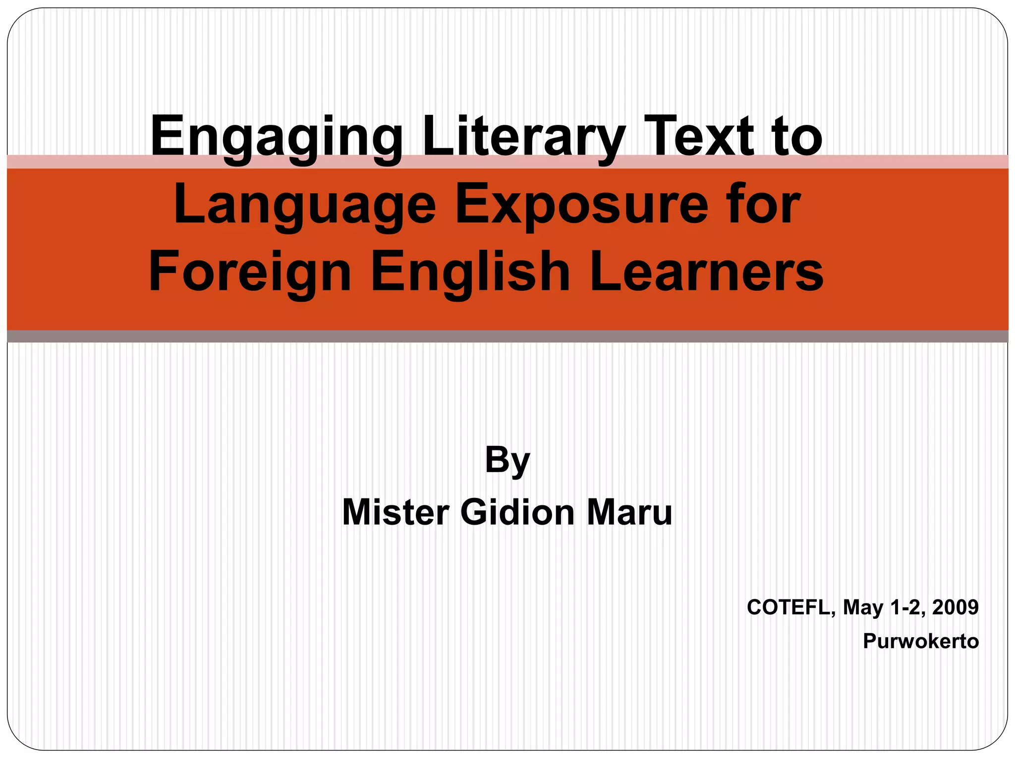 The document discusses the challenges faced by foreign English learners, including difficulties in communication, overcrowded classes, and lack of resources. It suggests solutions such as studying abroad, joining English courses, and using literary texts to enhance language exposure. The document emphasizes the importance of engaging literary texts in EFL classrooms to facilitate better learning experiences and expressions in English.