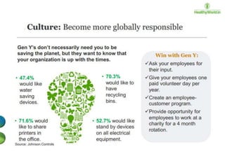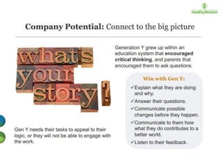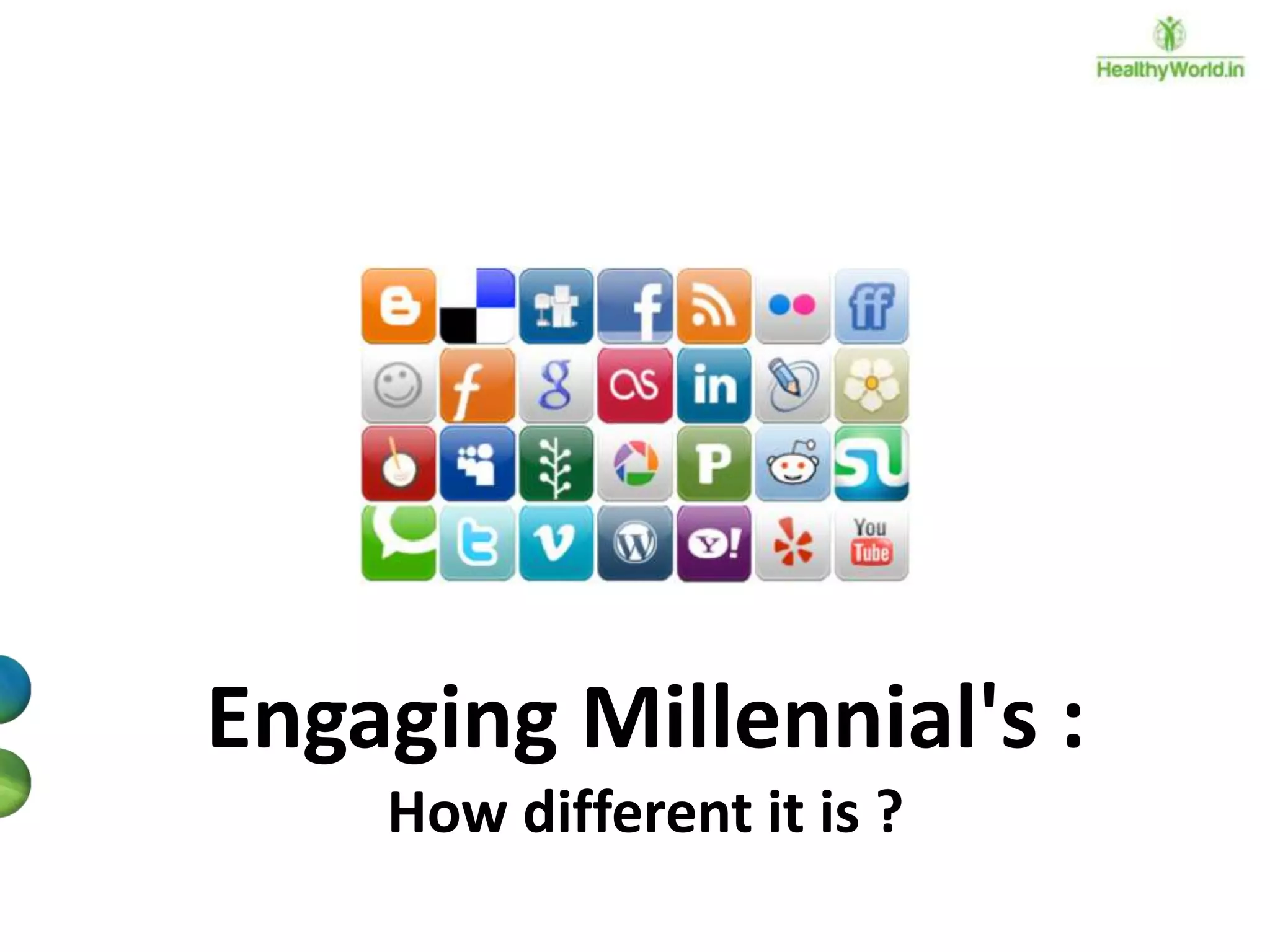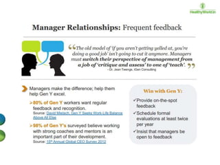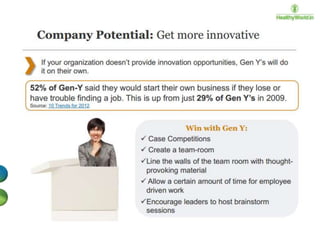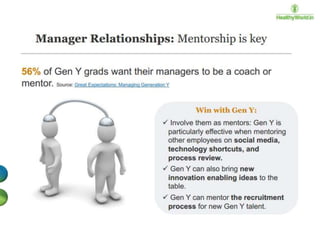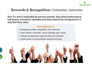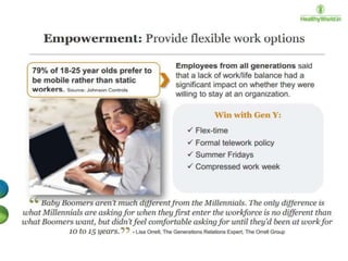 The document discusses the engagement of the millennial generation (born 1980-1995), which represents a significant portion of the global and U.S. populations and is transforming consumer and corporate experiences. It outlines the changing definitions and elements of employee engagement, emphasizing the need for constant feedback, mentorship, and integration of fun in work to keep millennials engaged. The document also addresses the influence of globalization and technology on workplace dynamics and the importance of adapting organizational communication and culture to meet millennial expectations.