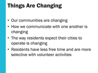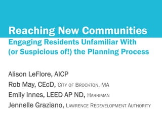 This document discusses strategies for engaging communities that are unfamiliar with or suspicious of the planning process. It notes that communities are changing and public engagement must evolve to reach more groups. Both traditional and new techniques are outlined, including workshops, drop-ins, social media, translations, and meeting people where they are at locations like neighborhoods and festivals. Using community leaders, technology like online forums, and addressing barriers like language, schedules, and childcare can help involve more residents. Case studies from Lawrence and Brockton highlighted targeted outreach through a listening tour. The overall message is that an evolving set of techniques is needed to communicate with diverse groups in their preferred ways.