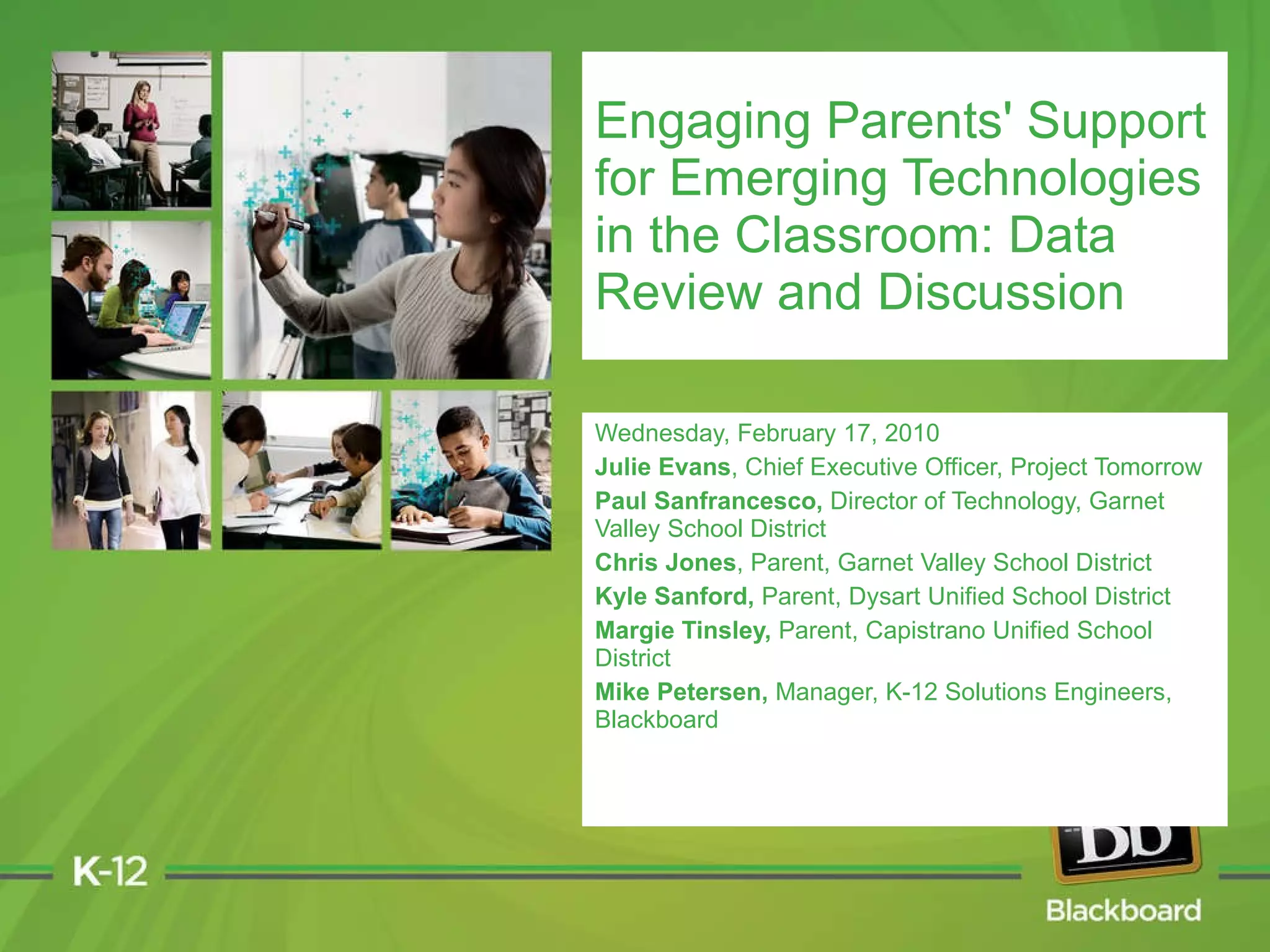 The document presents insights from a panel discussion by Project Tomorrow, highlighting the importance of engaging parents in supporting emerging technologies in education. It outlines findings from the Speak Up national initiative, emphasizing the disconnect between students' technological usage outside school and the limitations they experience within the classroom. The survey data reveals parents' varied satisfaction levels with technology in schools and their suggestions for improvement, underscoring the need for better integration of technology in education.
