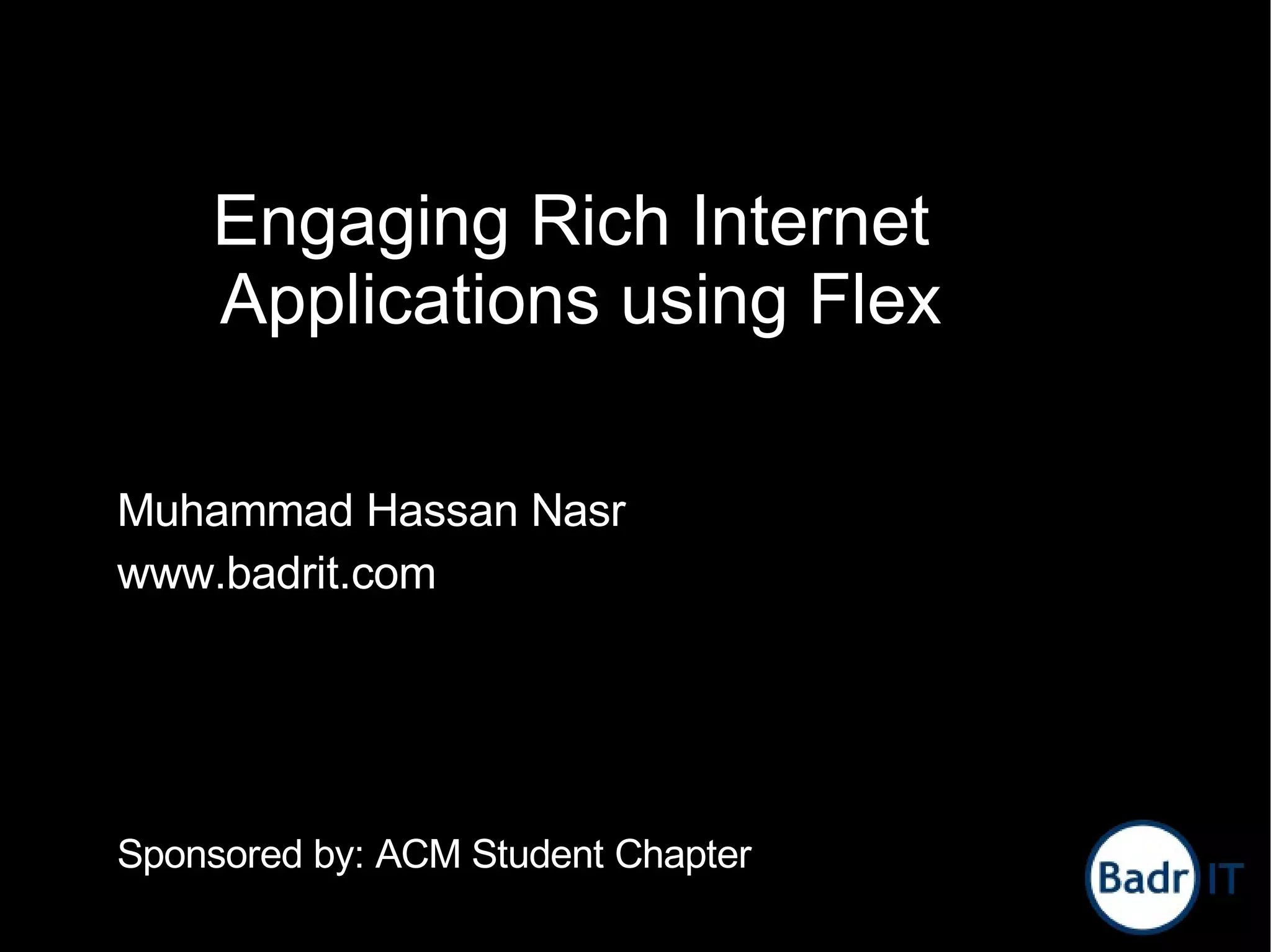 The document discusses Rich Internet Applications (RIA) and the Flex framework, detailing its advantages and architecture. It highlights the characteristics of RIA, such as being browser-based and accessible without installation, and showcases various Flex applications. The presentation aims to inform attendees about the benefits of using Flex over traditional web applications.