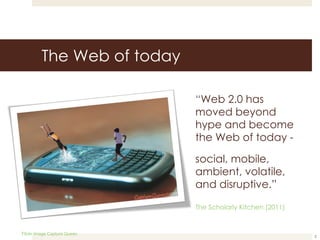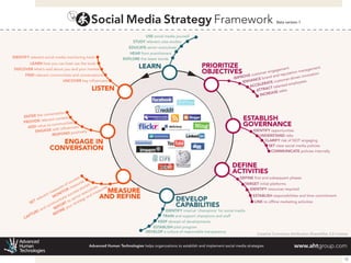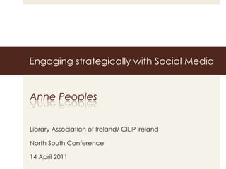 The document discusses engaging strategically with social media for libraries. It outlines opportunities for timely delivery of content, modernizing services, and reaching new users. Challenges include capacity, motivating staff, selecting tools, and measuring impact. Barriers include management concerns about inappropriate use and technical issues. The document provides advice on objectives, audiences, platforms, management roles, risks, policies, and evaluation for effective social media use by libraries.