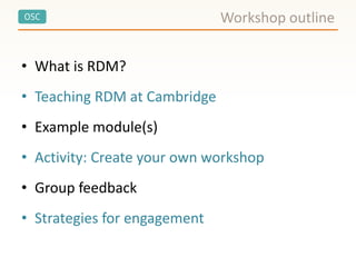 This document outlines a modular approach for teaching research data management (RDM) skills. It provides examples of RDM modules focused on data organization for science, technology, engineering and humanities disciplines. Each module introduces key RDM concepts and includes hands-on activities. For example, the data organization module for science discusses file naming conventions and organizing physical samples. It encourages audience participation to discuss best practices. The document emphasizes tailoring RDM teaching to different subject areas and audiences through customizable modules and activities.