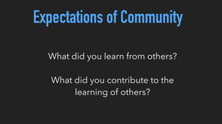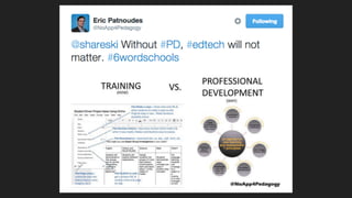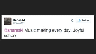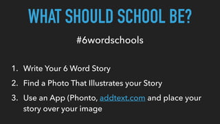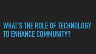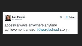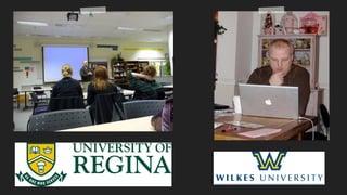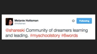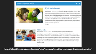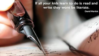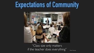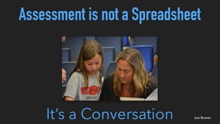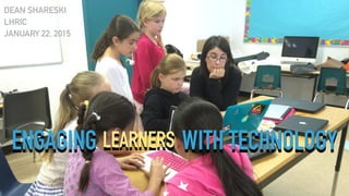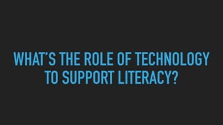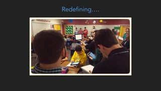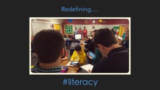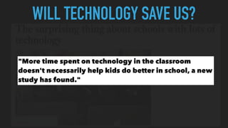 The document discusses engaging students with technology and rethinking education. It addresses how technology can support literacy, community, and assessment. Some key ideas include using technology to personalize learning, connect students in multiple ways, and make assessment a conversation rather than just scores on a spreadsheet. The role of joy in education is also discussed.