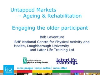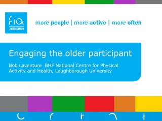 The document discusses engaging older adults in physical activity programs. It covers who to target, important messages to convey, using evidence to design effective programs, and making programs age-friendly. Key points include segmenting the older adult market based on health, life stage, and readiness to change. Messages should focus on benefits, safety, and feeling comfortable. Evidence shows cognitive behavioral strategies and social support increase program adherence and effectiveness. Facilities, equipment, programs, and staff should be tailored to meet the needs and abilities of older adults.