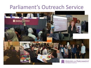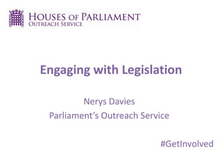 The document provides an overview of how citizens can engage with the legislative process in the UK Parliament. It explains the core tasks of Parliament including proposing and passing laws, and describes the various stages a bill progresses through, from second reading debates to committee stages. Citizens are encouraged to get involved by contacting their MP, submitting evidence to committees, or attending debates to make their voices heard on issues.