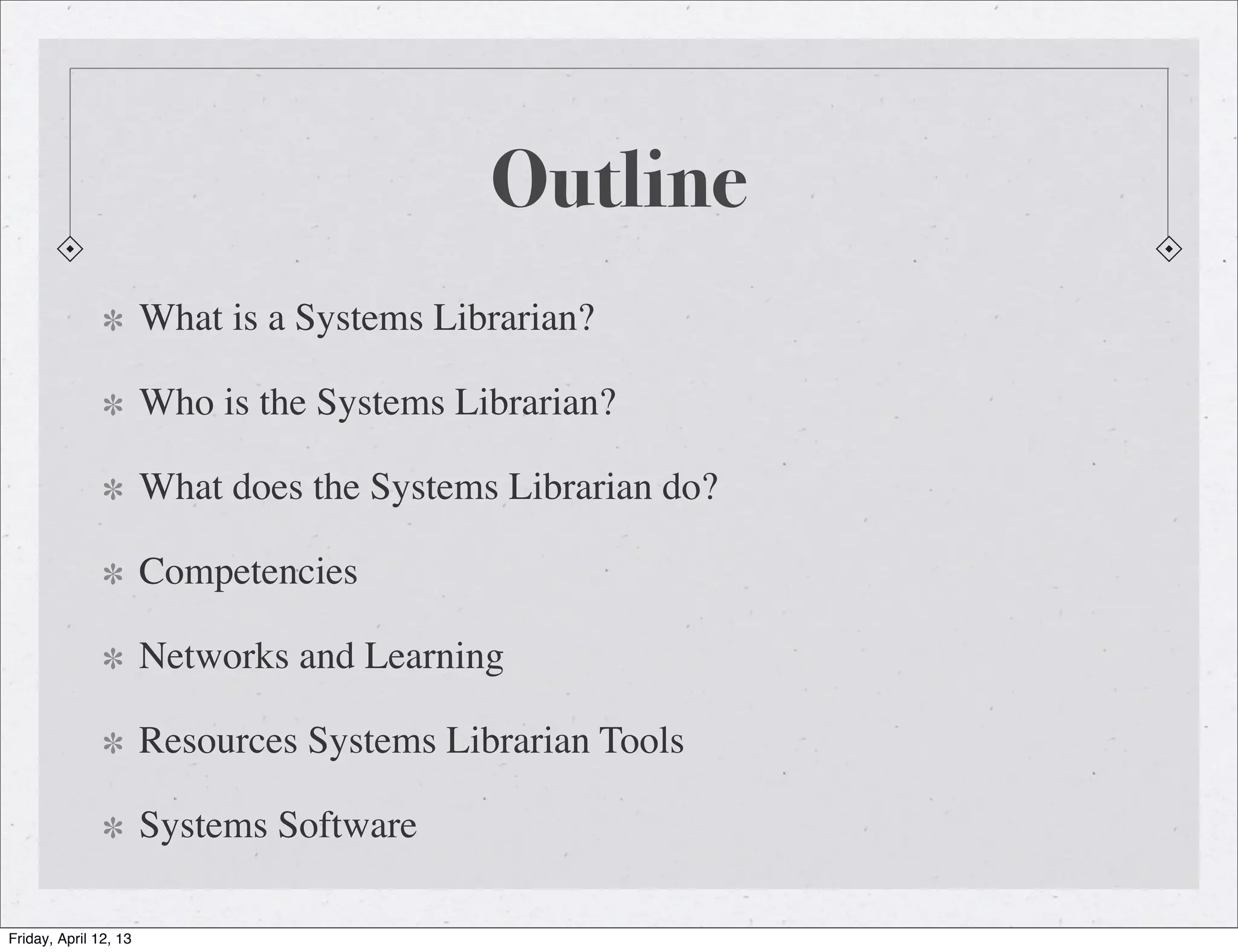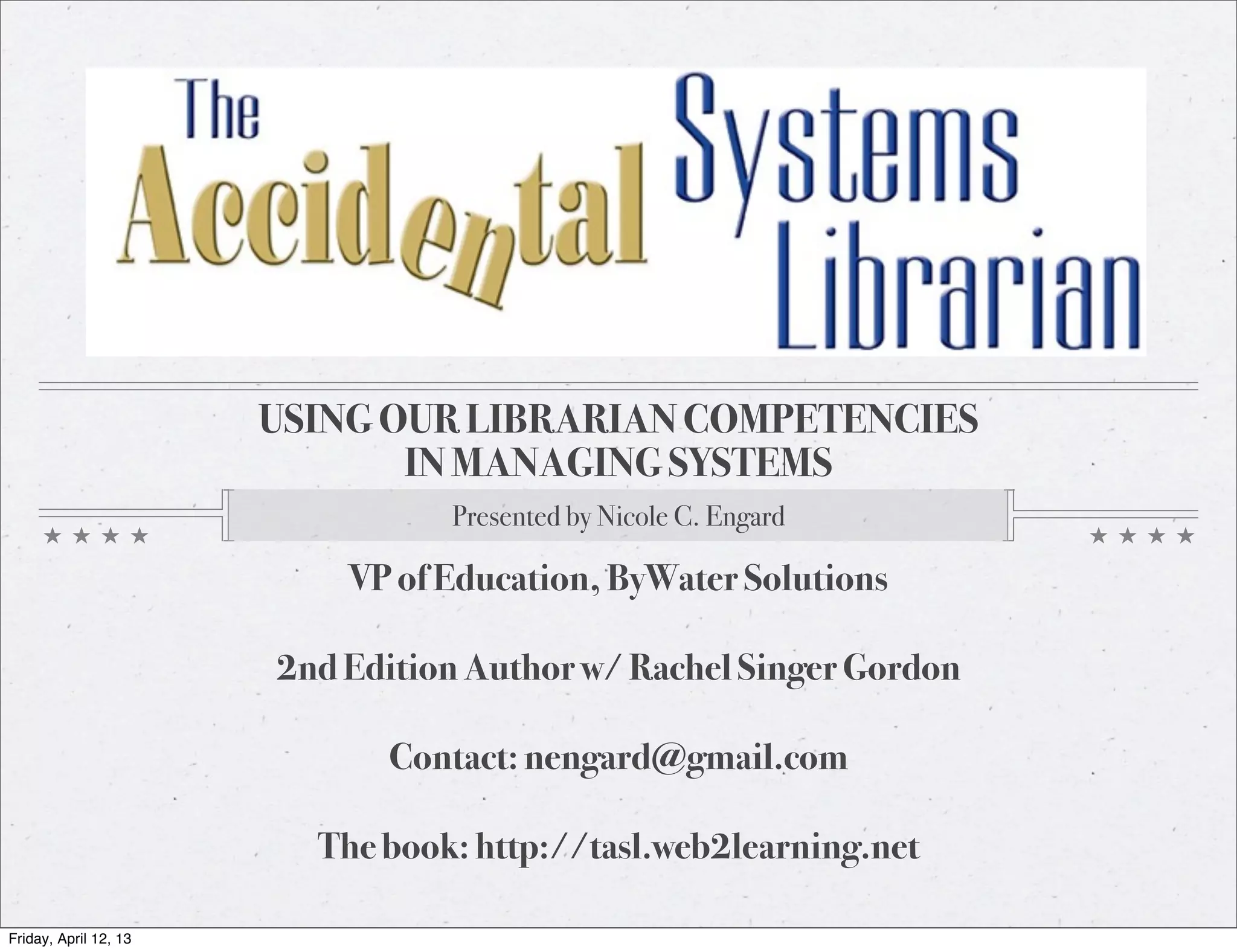 The document outlines the role and responsibilities of a systems librarian. It discusses that a systems librarian understands both libraries and computers and puts these fields into context. The librarian manages all aspects of a library's systems, including the website, integrated library system, computers, and applications. The document lists competencies needed, such as learning database languages, programming languages, networking basics, and Linux server management. It emphasizes that systems librarians must continually learn new skills through online courses and resources.