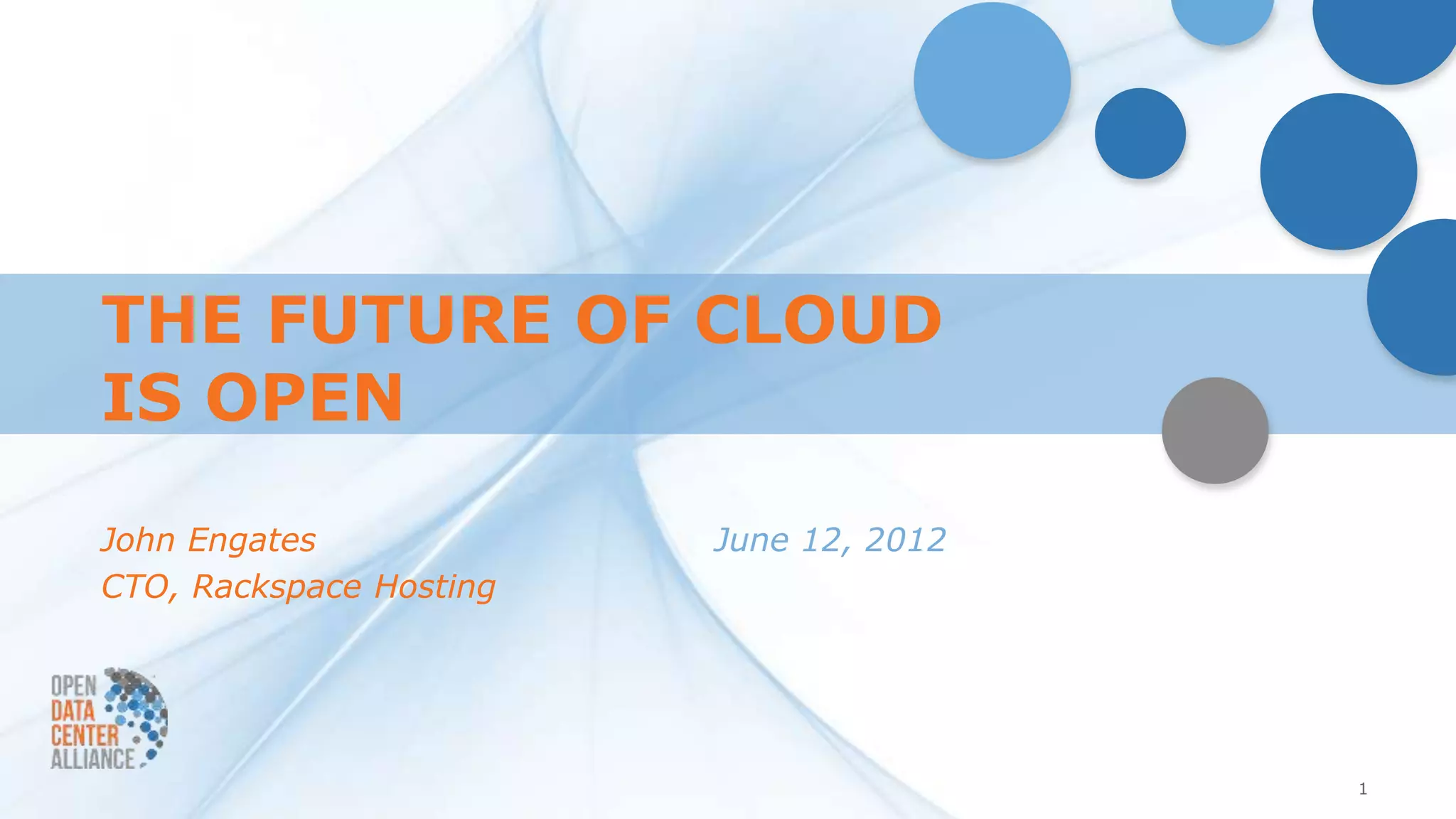 The document discusses the future of cloud computing being open through multi-vendor interoperability. It notes the benefits of open solutions for both vendors and consumers in accelerating technology shifts at lower costs. Rackspace has benefited from adopting and leading open solutions like OpenStack, which allows building public and private clouds with common application programming interfaces (APIs).