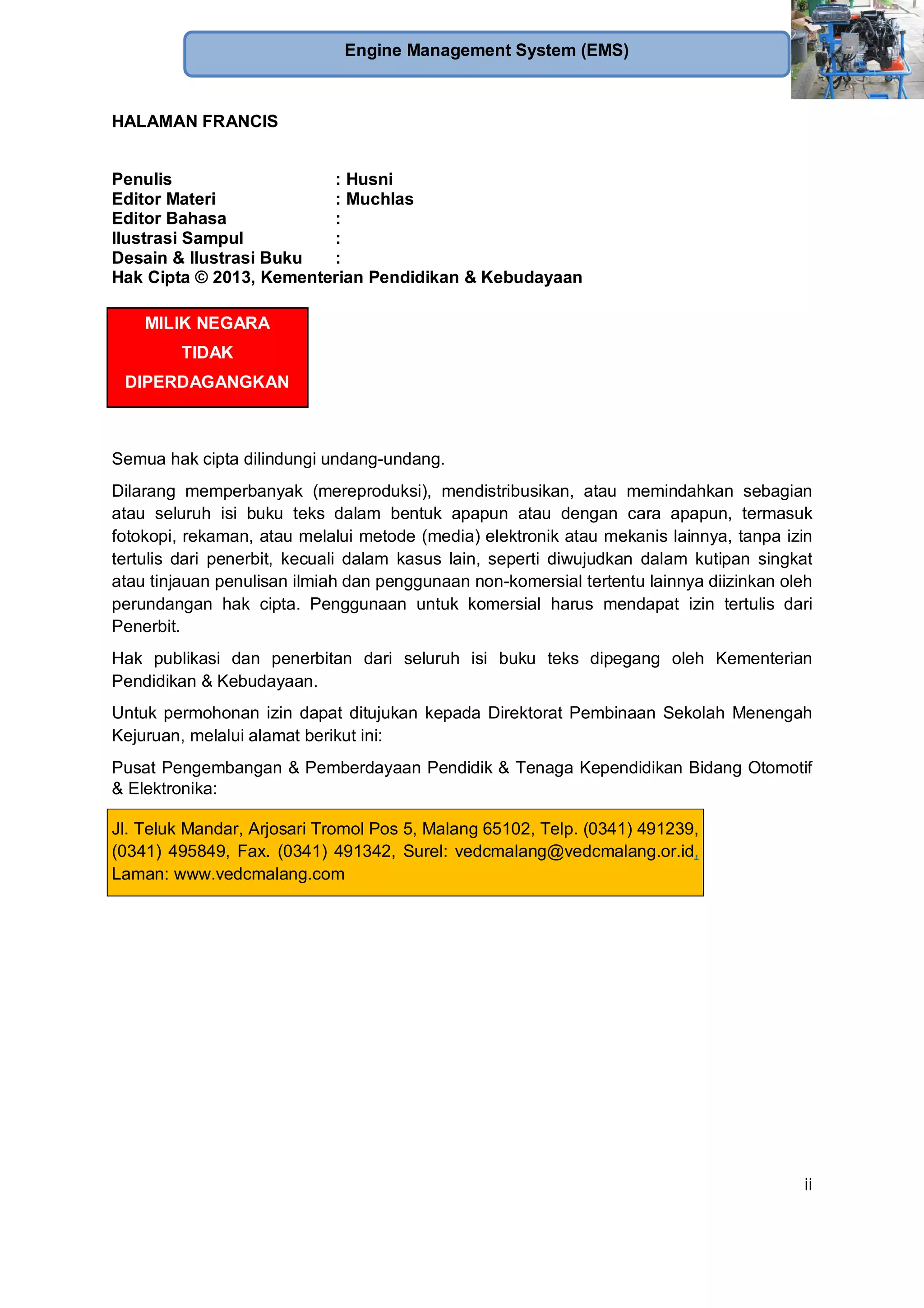 Buku ini membahas sistem manajemen mesin (EMS) untuk siswa sekolah menengah kejuruan di bidang otomotif. Penyusunannya mengikuti paradigma kurikulum abad 21 yang berfokus pada pembelajaran aktif dan proses penelitian oleh siswa. Terdapat berbagai kegiatan pembelajaran dan materi yang dirancang untuk meningkatkan keterampilan proses sains dalam pemahaman mesin dan sistem terkait.