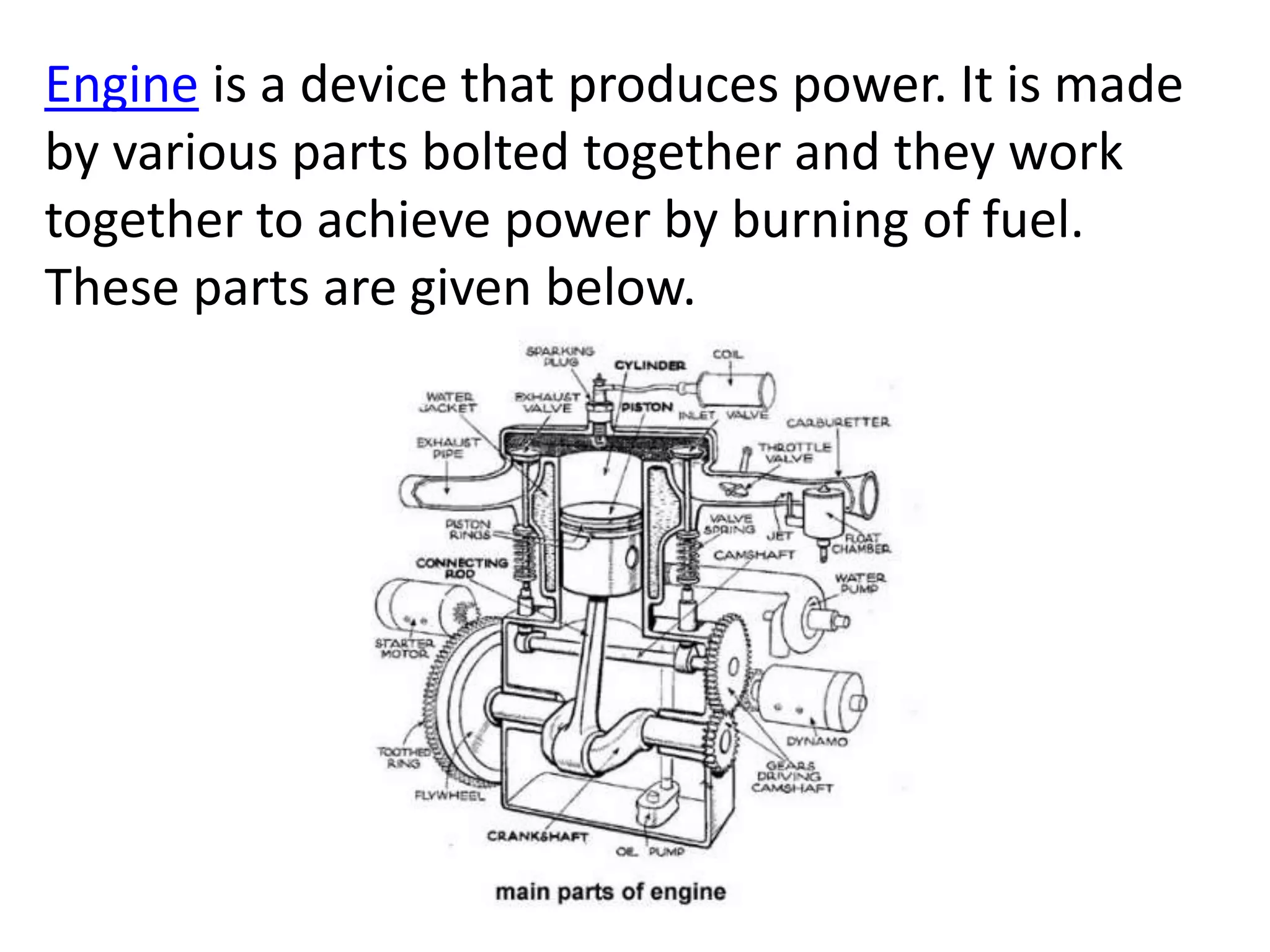 An engine is a device that produces power by burning fuel. It is made up of various parts bolted together that work together, including a cylinder block where combustion occurs, pistons that transmit power to the crankshaft by compressing fuel mixtures, and a crankshaft that converts the reciprocating motion of the pistons into a rotary motion to power vehicle wheels. Other main parts include cylinder heads, connecting rods, valves, spark plugs or injectors, and manifolds. Together, these parts work to achieve engine power through the burning of fuel.