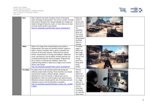 This document contains a glossary of terms related to video game design and development. It provides definitions for terms like demo, beta, alpha, pre-alpha, gold, debug, automation, white-box testing, bug, vertex shader, and pixel shader. For each term, it gives a short definition from an online source and describes how the term relates to the production practice of video games.