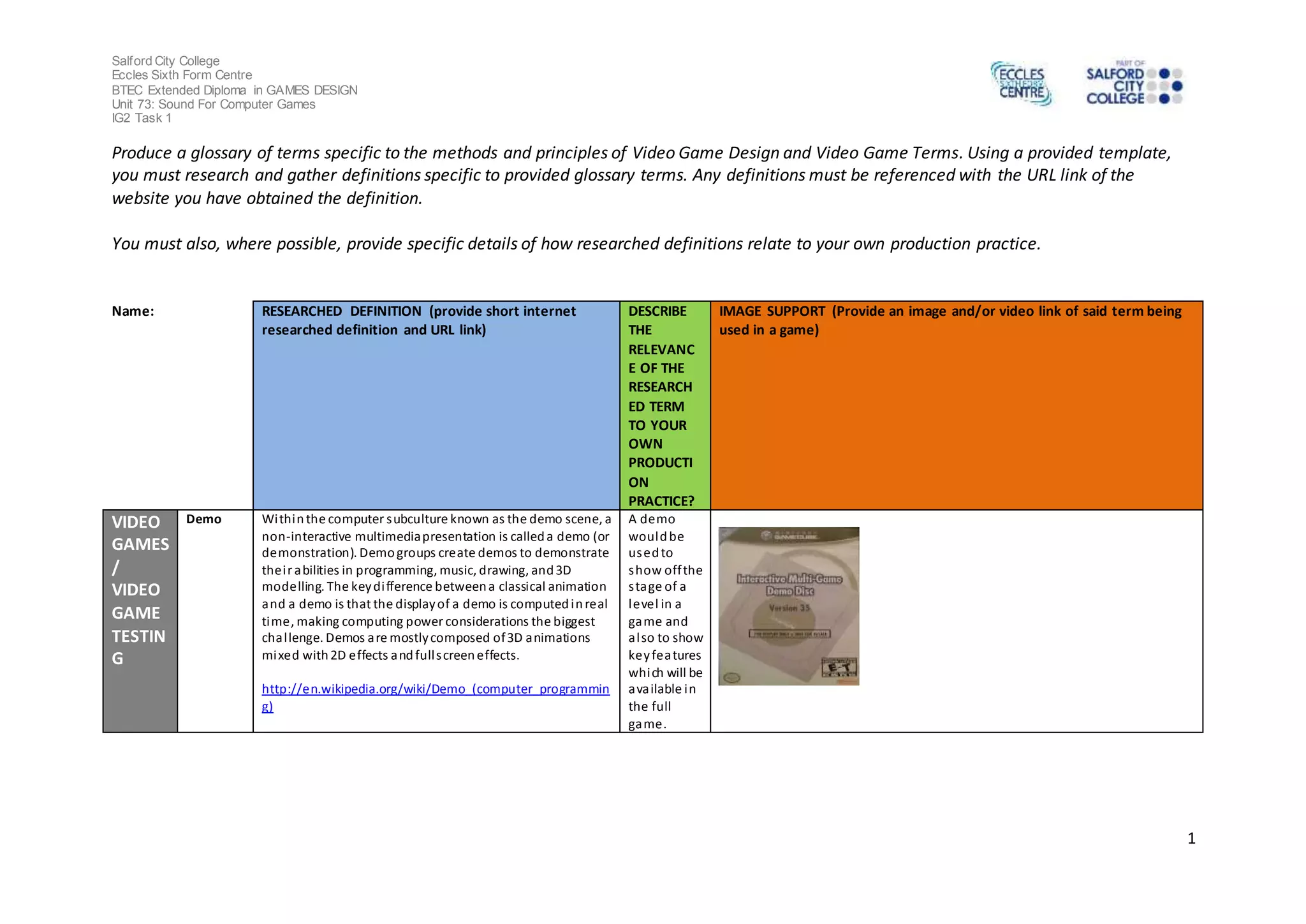 This document contains a glossary of terms related to video game design and development. It provides definitions for terms like demo, beta, alpha, pre-alpha, gold, debug, automation, white-box testing, bug, and others. For each term, it gives a short definition from an online source as well as a one sentence description of how the term relates to the production practice of video games. Images or videos are also provided for some terms to illustrate their usage in games.