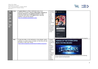 This document contains a glossary of terms related to video game design and development. It provides researched definitions from online sources for terms like demo, beta, alpha, pre-alpha, gold, debug, vertex shader, pixel shader, and more. For each term, it also describes how the term relates to the author's own video game production practice, and includes an image or video to illustrate the term.