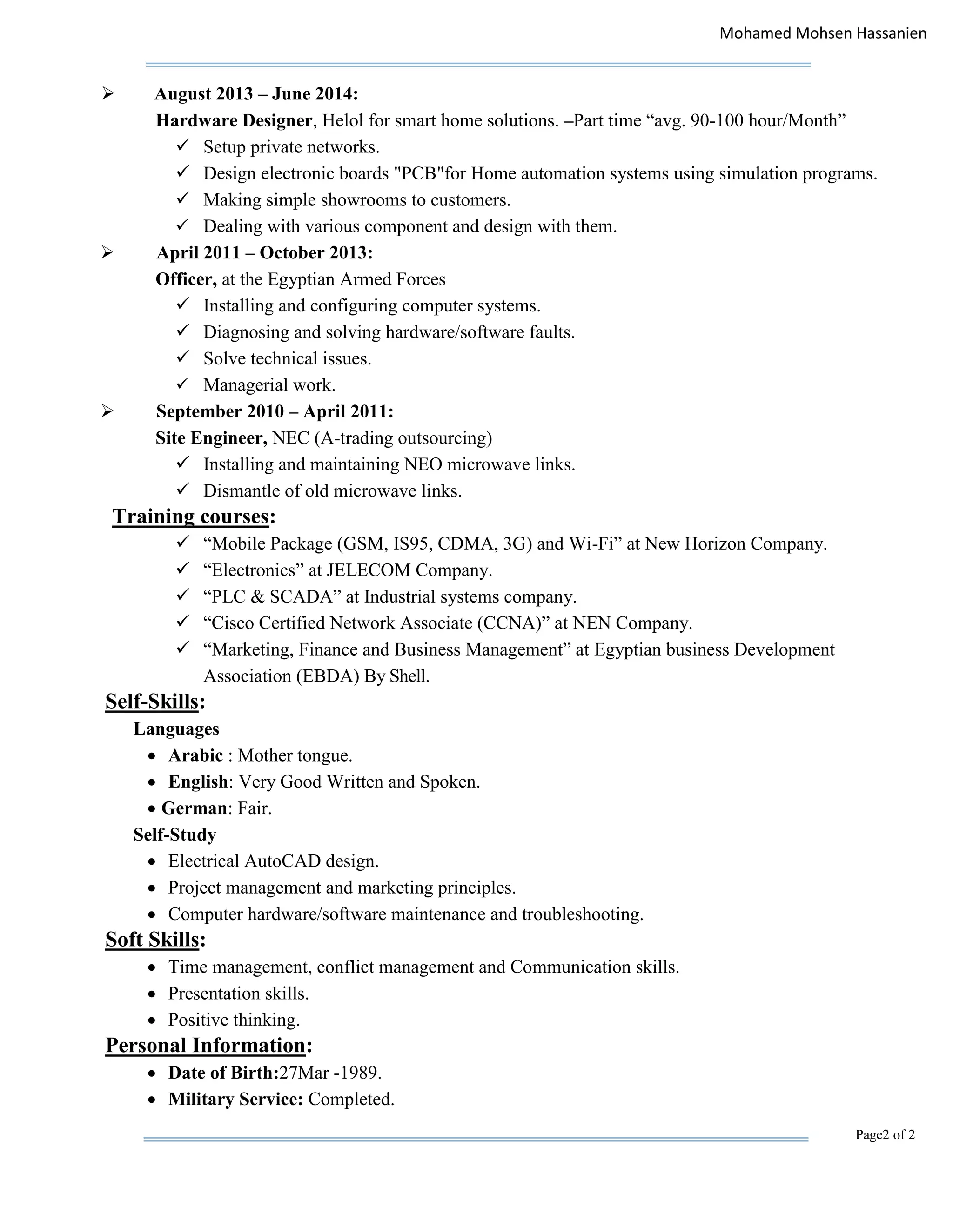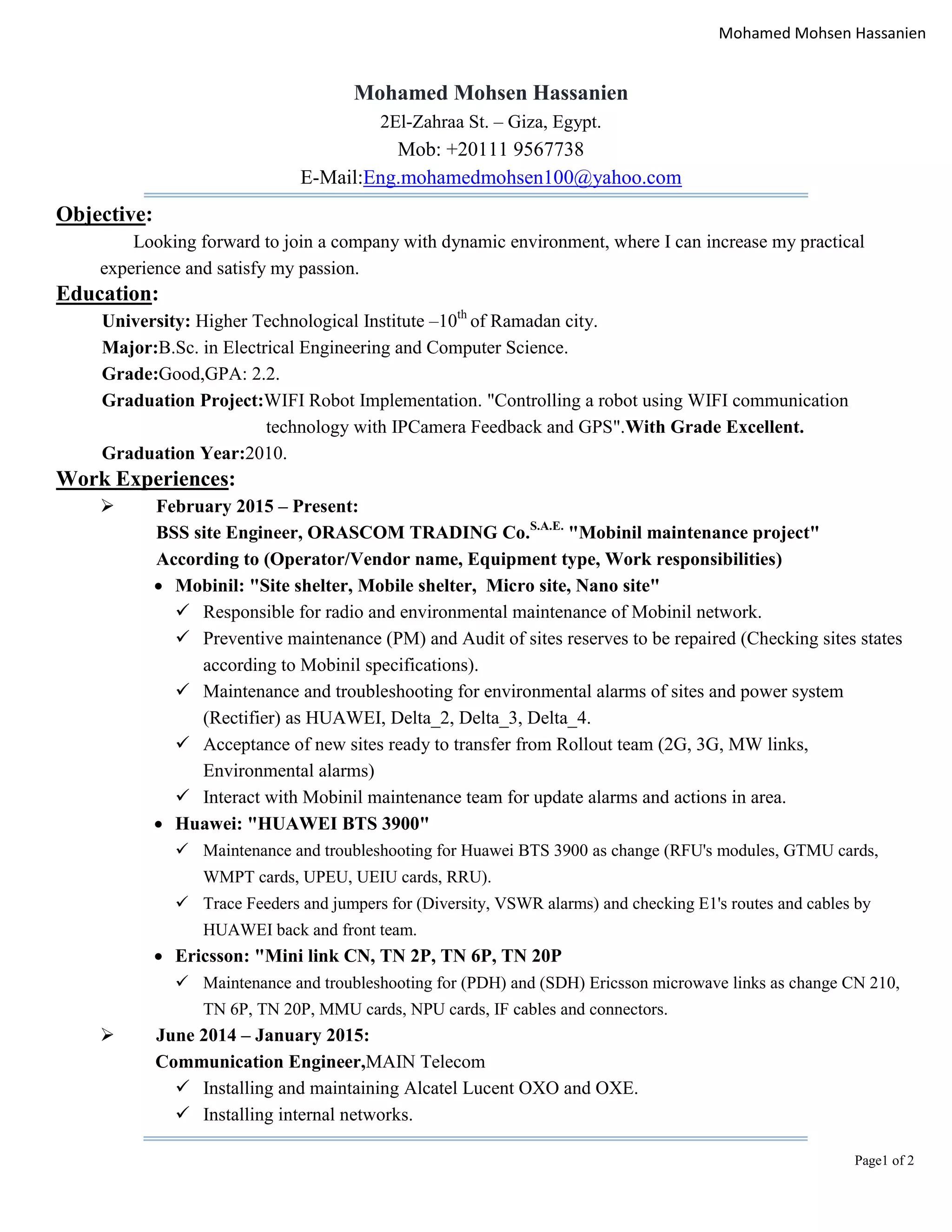 Mohamed Mohsen Hassanien is seeking a position that allows him to gain practical experience and satisfy his passion. He has a B.Sc. in Electrical Engineering and Computer Science from Higher Technological Institute with a GPA of 2.2. His graduation project involved controlling a robot using WIFI communication technology with an IP camera and GPS. His work experience includes positions maintaining Mobinil's network infrastructure, installing and maintaining telecom systems, designing electronic boards, and installing computer systems for the Egyptian Armed Forces. He has completed several training courses and has strong English language skills.