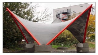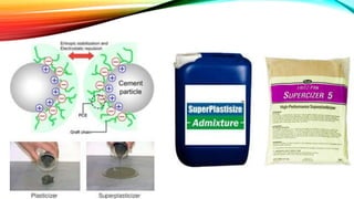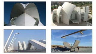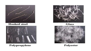 The document discusses bendable or engineered cementitious composite (ECC) concrete. It is a type of fiber-reinforced concrete that is ductile and crack-resistant. ECC concrete uses microfibers, a slick coating on the fibers, fine sand, and superplasticizers. It bends like metal and is stronger and more durable than regular concrete. Structures made of ECC concrete are earthquake and crack resistant. Examples of uses include earthquake-proof buildings, flexible concrete canvases for military use, and more durable bridges and roads.