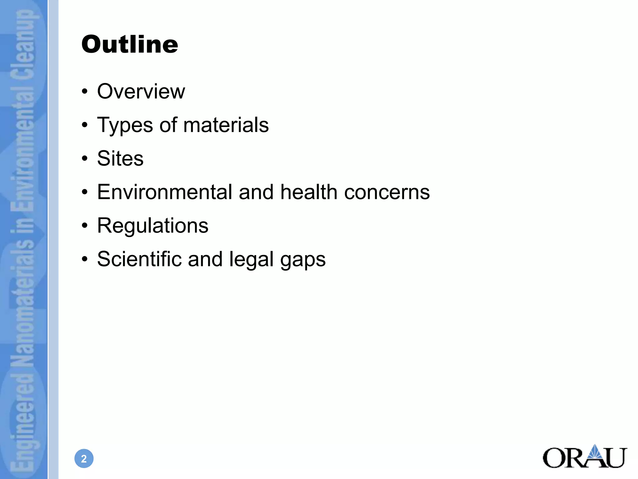 The document discusses the use of engineered nanomaterials in environmental remediation, highlighting their potential benefits and the associated environmental, health, and regulatory concerns. It outlines various types of nanomaterials used in remediation, the current application at numerous sites, and the lack of specific regulations governing their use. The author emphasizes the need for further research, best practices, and cooperation among stakeholders to address unanswered questions regarding the safety and effectiveness of these technologies.