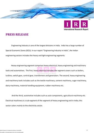 This document provides a market research report on the engineering industry in India. It discusses the key segments of the heavy and light engineering industries in India. The heavy engineering segment includes heavy electrical, heavy engineering and machinery, and automotives. The light engineering segment includes low and high technology products. The report highlights growth drivers like the power and infrastructure sectors. It also discusses government initiatives like Special Economic Zones and incentives for research and development to promote the engineering industry in India. Tables and figures present data on industry size, exports, investments and the scope of different market segments.