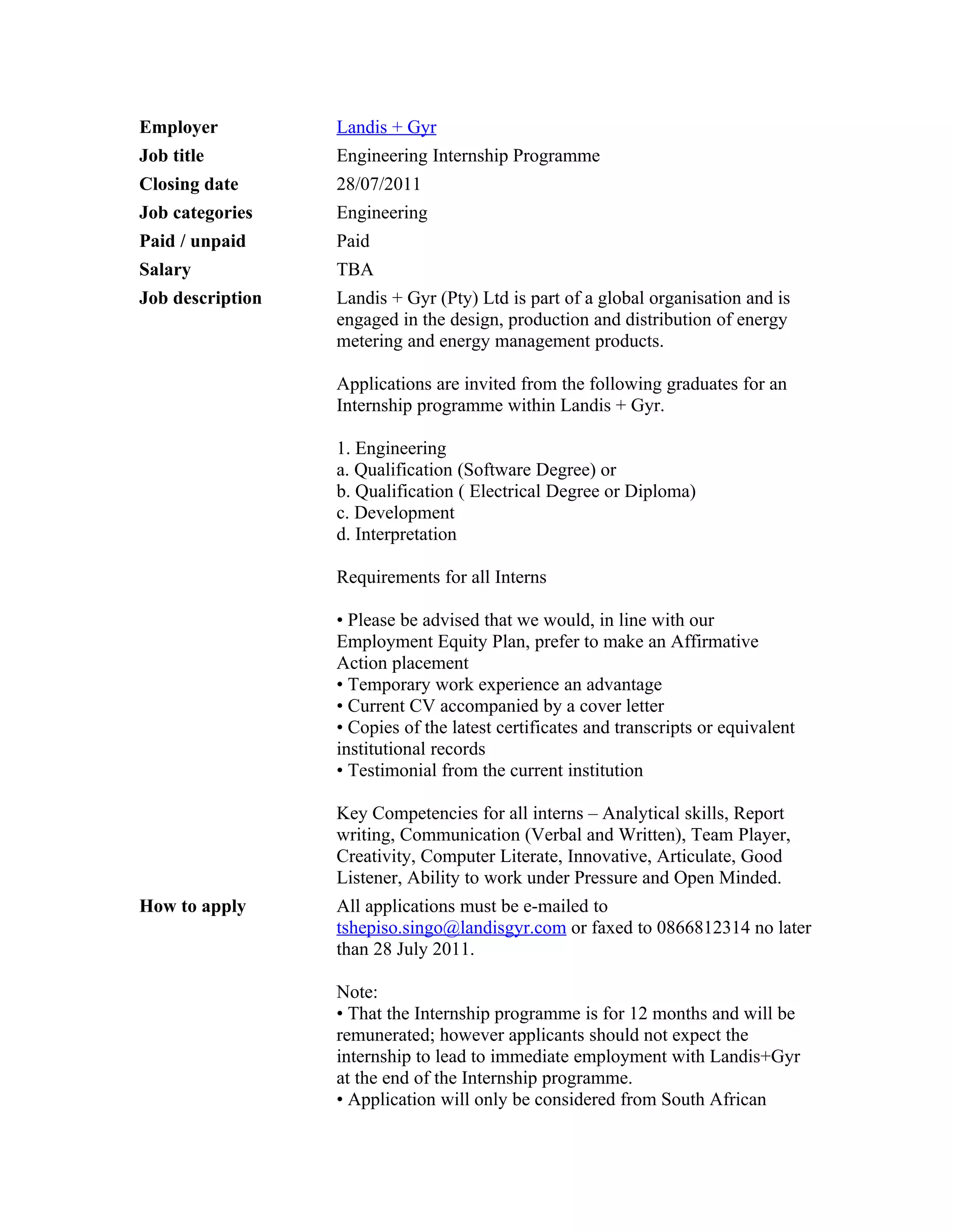 Landis + Gyr is seeking engineering interns for a 12-month paid internship program. The internship opportunities are available for graduates with software, electrical, or mechanical engineering degrees or diplomas. Responsibilities will include development and interpretation work. Successful candidates will have strong analytical, communication, and computer skills as well as the ability to work well in teams and under pressure. Applications are due by July 28, 2011 and should be emailed to the provided contact.