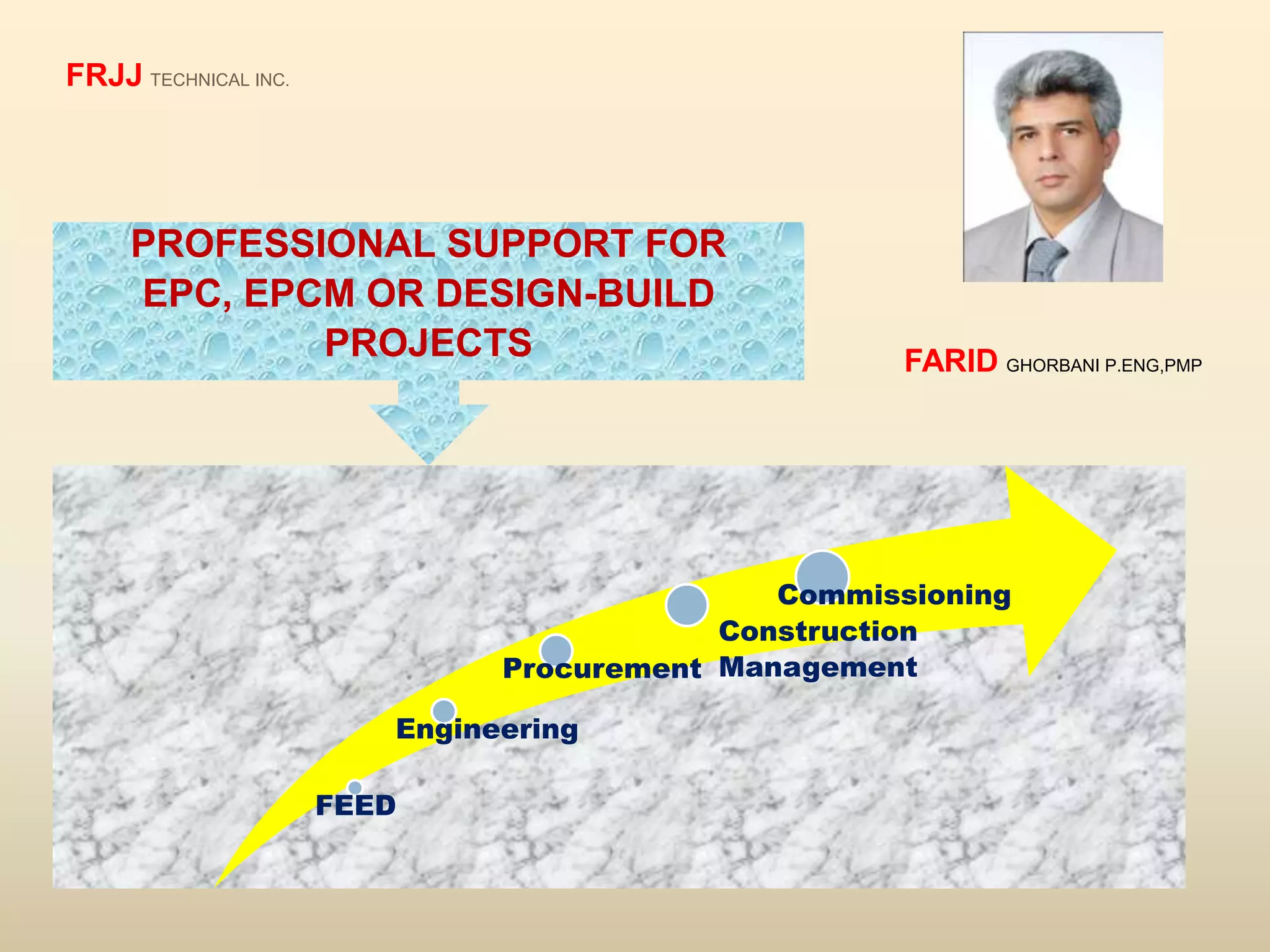 FRJJ Technical Inc. provides engineering, procurement, and construction management services for EPC, EPCM, and design-build projects. The company offers services including proposal preparation, structural calculations, technical specifications, drawings, construction support, and more. Using FRJJ helps avoid costs associated with directly employing staff and allows clients to pay a lump sum or hourly rate for project work. Examples of past projects include industrial facilities, residential towers, commercial buildings, and infrastructure.