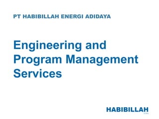 PT Habibillah Energi Adidaya is a multidisciplinary professional services company that provides engineering, technology innovation, and business strategy consulting services. It has a team of Indonesian and expatriate engineers with over 25 years of experience. The company delivers services including strategic planning, engineering, project management, and technical advisory across various sectors such as power generation, energy plants, technologies innovation, and mining & metallurgy. Key services include feasibility studies, project development, management and execution support for projects in thermal and renewable power, oil and gas, biofuels, and other industries.