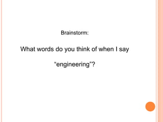 The document explores the concept of engineering, highlighting that engineers are innovative problem-solvers who improve the world through design and creation. It categorizes various types of engineers, such as chemical, civil, electrical, and mechanical, and discusses the positive aspects of engineering careers, including job satisfaction and income potential. A recommended next step is visiting a website for more information on discovering engineering careers.