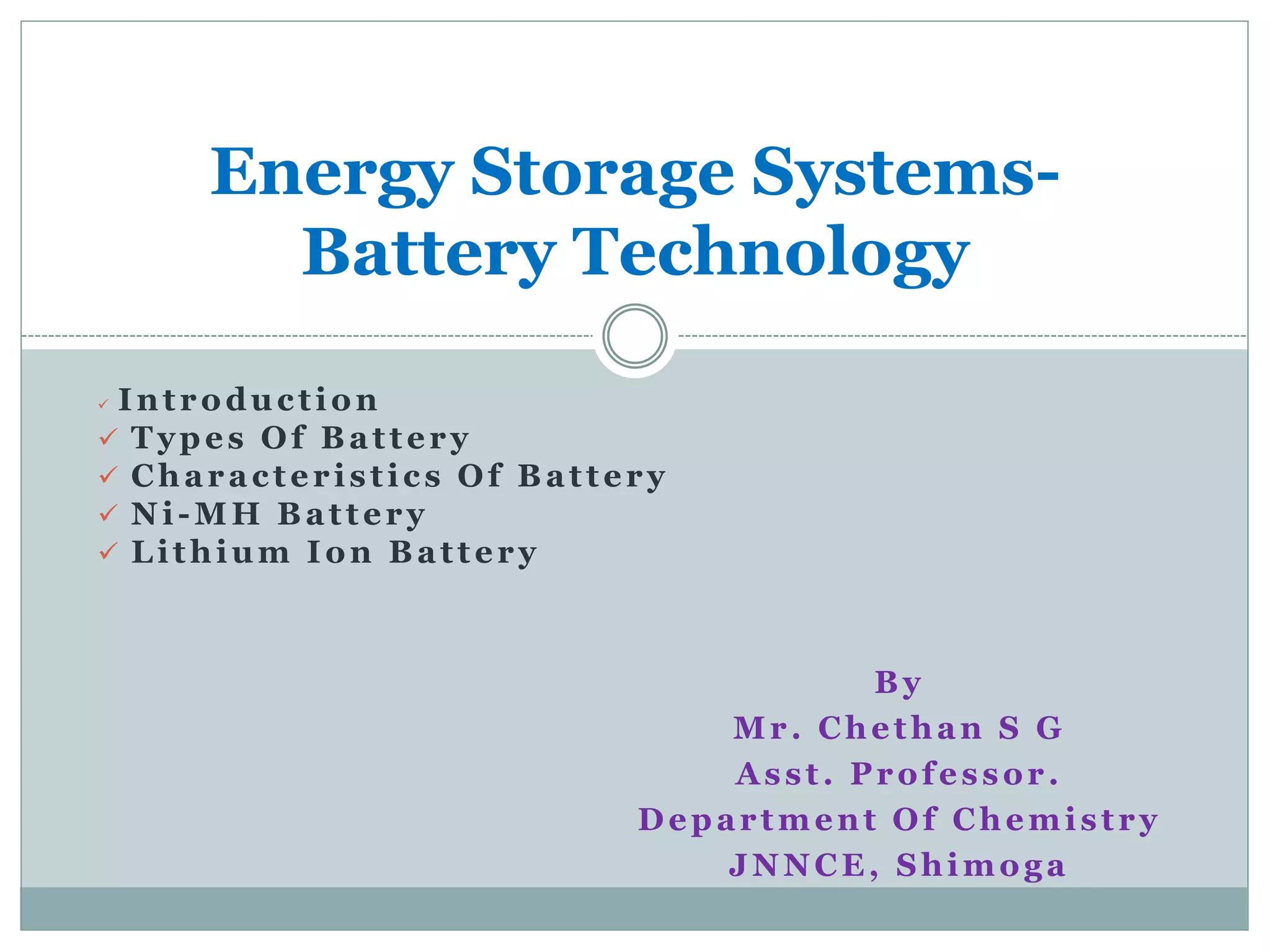 This document discusses different types of battery technology. It introduces batteries and their components. There are three main types of batteries: primary cells which are not rechargeable, secondary cells which are rechargeable, and reserve batteries which have a long shelf life. Two specific battery technologies discussed are nickel-metal hydride batteries, which use metal hydrides as the anode, and lithium-ion batteries. Key characteristics of batteries include their emf, current, capacity, efficiency, cycle life, power density, and shelf life.