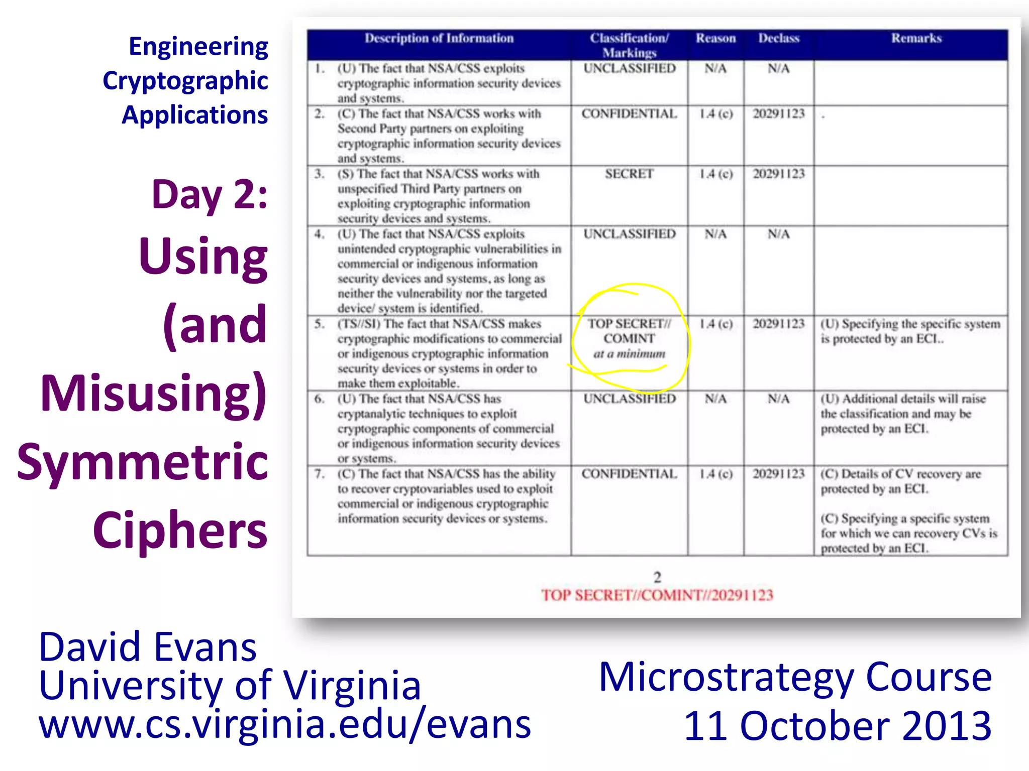 This document discusses using symmetric encryption for applications beyond simple transmission of encrypted messages. It covers generating cryptographically secure random keys, using block cipher modes like CBC and CTR to encrypt files, and securely storing encryption keys and initialization vectors. Generating true randomness is impossible, so physical sources must be amplified with cryptographic pseudorandom number generators. Commonly used block cipher modes like ECB leak information, while CBC and CTR avoid this if properly implemented with random or changing nonces/IVs. Storing keys securely, such as encrypting them with a password-derived key, is also important for practical encrypted storage systems.