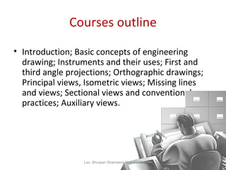 The document outlines a course on engineering drawing, covering topics such as basic concepts, instruments, projection methods, and types of drawings like orthographic and isometric views. It emphasizes the importance of standards, graphic and word language in drafting, and the necessity of using proper tools and techniques during the drawing process. Quizzes and class participation are critical for grading, and adherence to drawing standards is essential for clear communication in technical drawings.