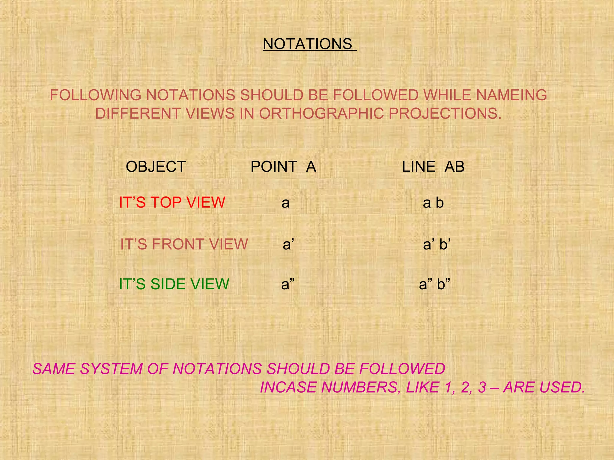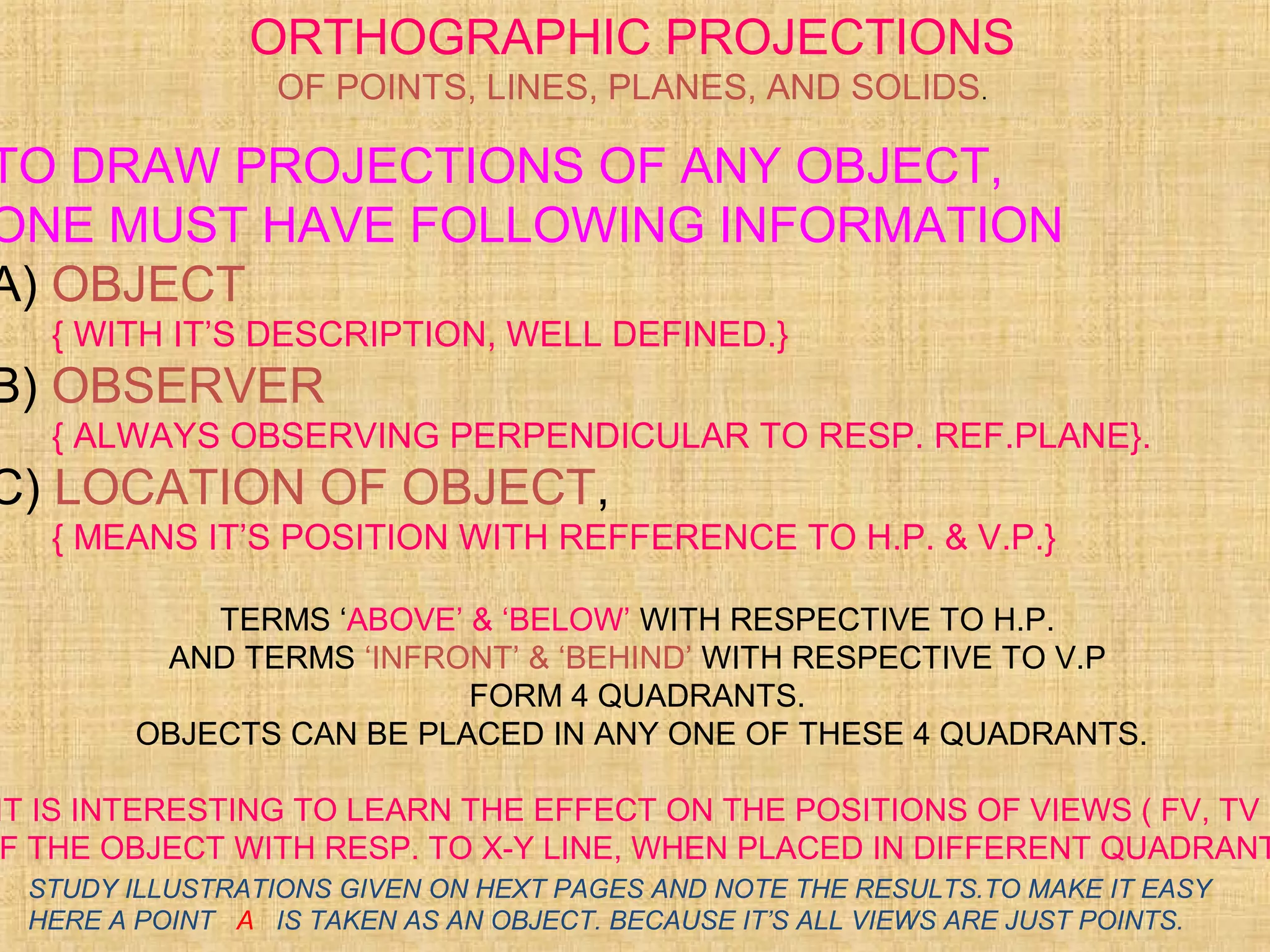 The document provides instructions for drawing orthographic projections of points, lines, and solids. It defines key terms like object, observer, horizontal and vertical planes. Points and lines can be placed in four quadrants defined by the horizontal and vertical planes. Front, top and side views are drawn by placing the views in the same plane for the observer. Examples are given of drawing the projections of a point and various orientations of lines, including determining true lengths and inclinations from the given views. Notations and procedures for determining views, true lengths, and angles are defined.