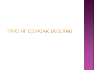 2) It discusses different types of costs like fixed, variable, and semi-variable costs that are considered in economic analysis and how they relate to volume. Capital expenditures and new product design are provided as examples of problems requiring decision making.
