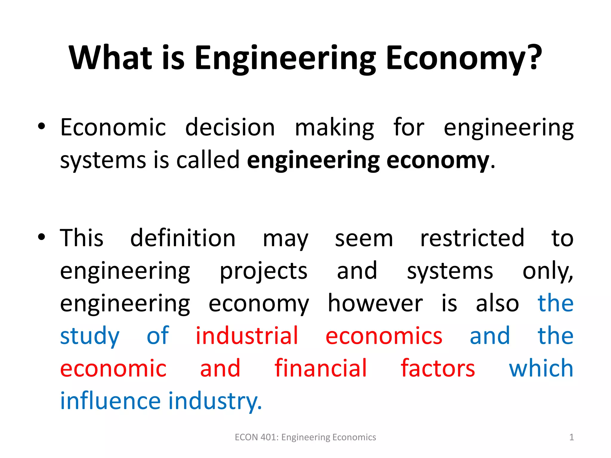Engineering economy focuses on economic decision-making for engineering systems, encompassing industrial economics and financial factors influencing industry. It provides techniques for evaluating alternatives, ensuring engineers utilize their technical knowledge to justify project selections and financial evaluations. The document highlights key principles and strategic decision types within engineering economics, emphasizing the importance of understanding the time value of money and risk-return relationships.