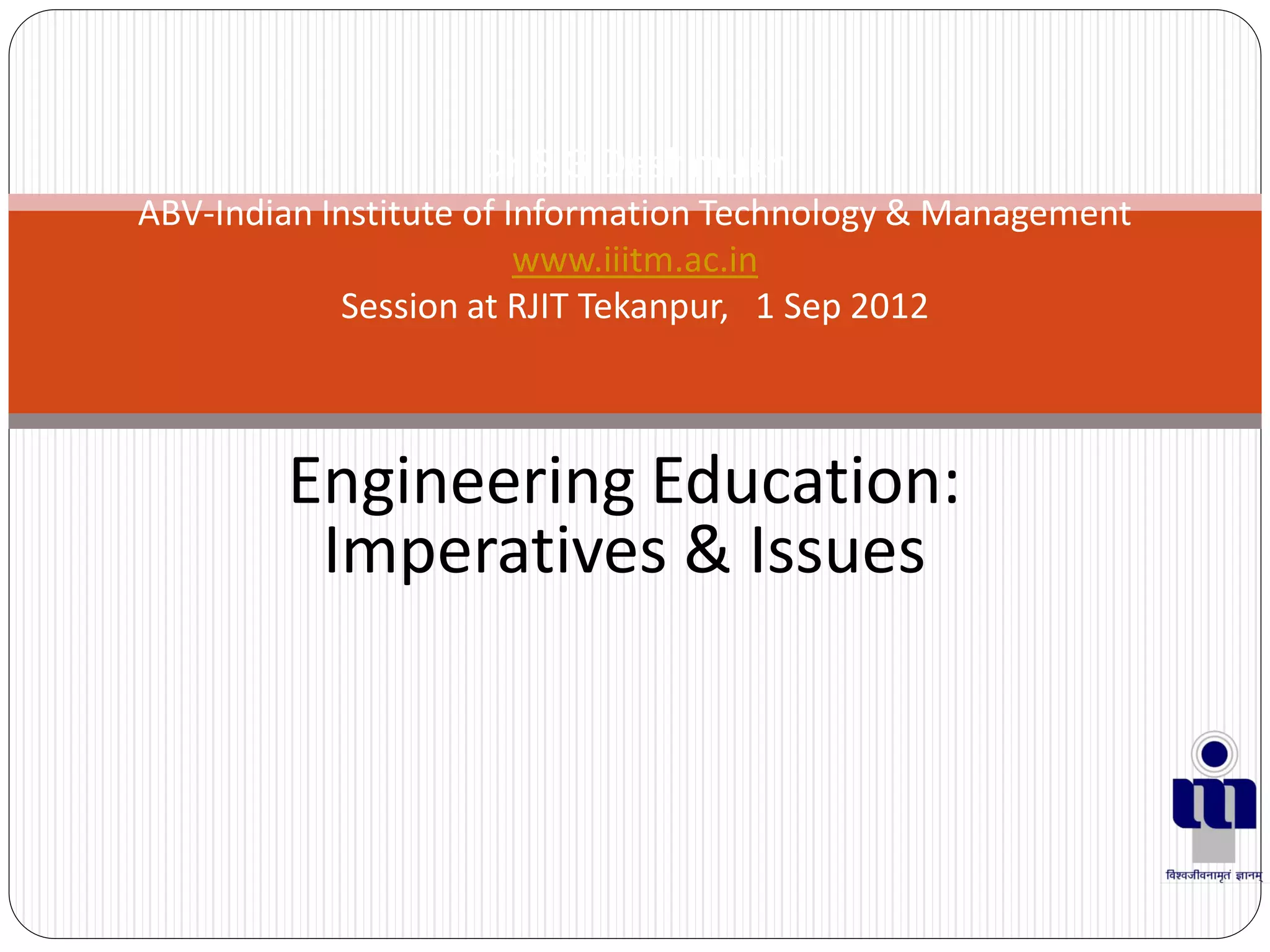 The document discusses the challenges and imperatives in engineering education, emphasizing the need for quality improvements driven by globalization, student and industry expectations. It highlights the weaknesses of current graduates and the essential skills they must possess, such as technical capability, communication, and teamwork. Key issues include faculty development, laboratory enhancements, industry linkages, and preparing students for employability in a rapidly evolving technological landscape.