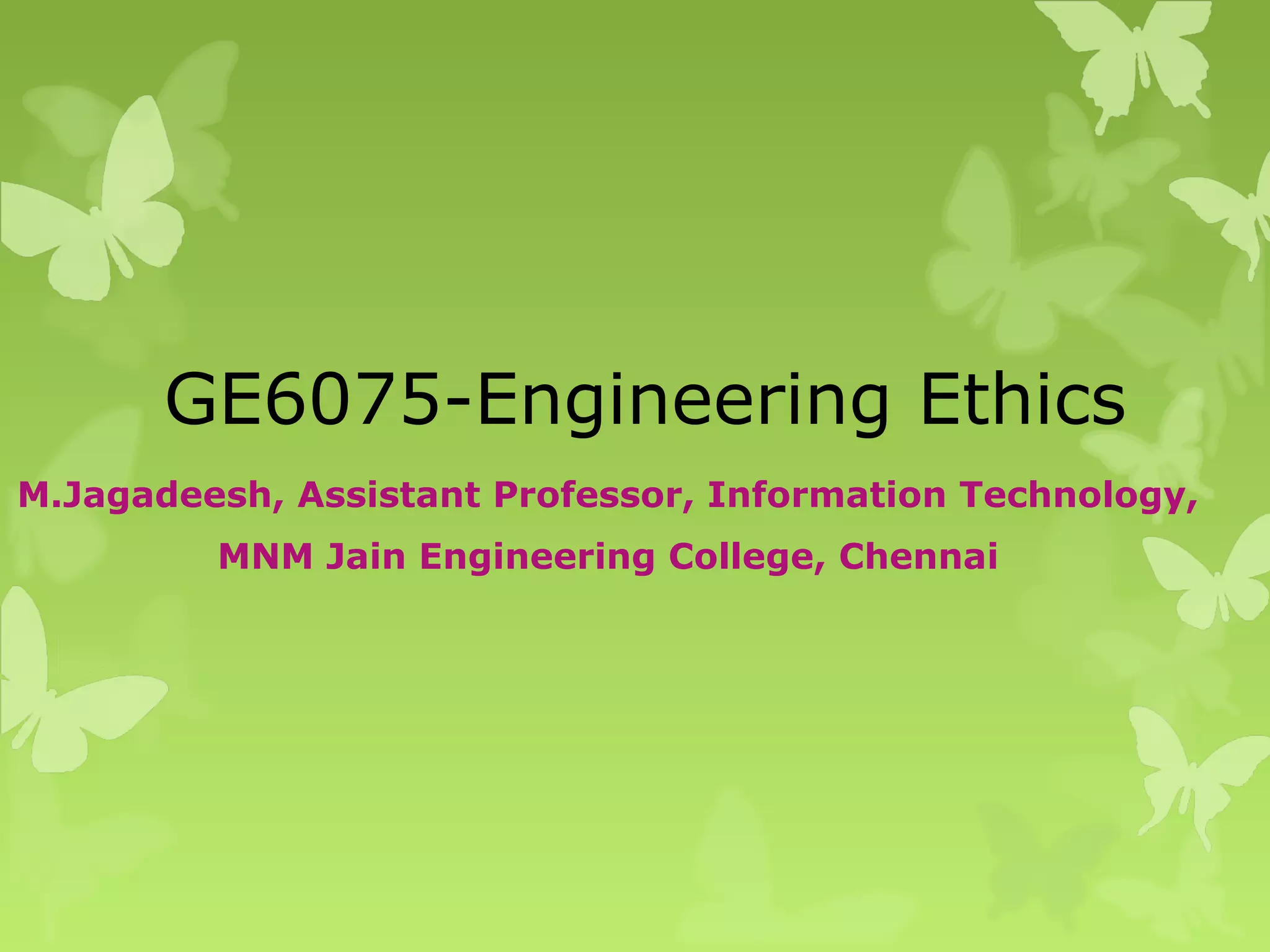 The document elaborates on the significance of engineering ethics, which involves understanding moral values, resolving moral issues, and justifying judgments in engineering practices. It covers various theories of moral development, including Kohlberg's and Gilligan's, and demonstrates the moral dilemmas that engineers face, such as public safety and organizational pressures. Ultimately, it underscores the importance of engineers integrating professional responsibilities with ethical considerations to prevent societal harm.