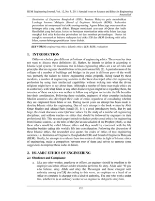 This document discusses engineering ethics from an Islamic perspective. It begins by defining engineering ethics in Islam as rules and principles that engineers should follow in their professional lives. It then outlines several Islamic ethics for engineering, including obedience, prioritizing public welfare and safety, trustworthiness, avoiding bribery, proper supervision and reporting, and truthfulness. The document also discusses codes of ethics from the Institution of Engineers Bangladesh and the Board of Engineers Malaysia, and evaluates them based on the outlined Islamic ethics, aiming to identify areas for improvement.