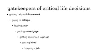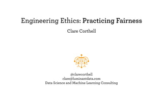 The document discusses the ethical implications of engineering and machine learning, focusing on fairness in predictive outcomes that affect significant life decisions. It highlights the issues of bias in data, the potential for discrimination through character testing, and the importance of constructing fairness explicitly in algorithms. The responsibility lies with data scientists to ensure fair practices to benefit both society and business.