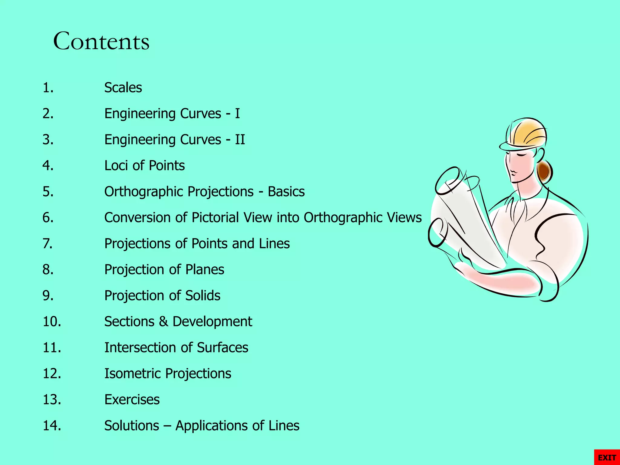 This document contains a table of contents for an engineering drawing course covering topics such as scales, engineering curves, orthographic projections, sections and developments, intersections of surfaces, and isometric projections. It includes definitions, methods, examples and practice problems for each topic. The objective stated is to use video effects to help visualize concepts in 3D and correctly solve problems through practice of drawing by hand with guidance from illustrations and notes provided throughout.