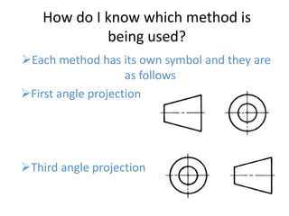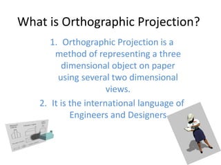 Orthographic projection is a method of representing a 3D object in 2D using multiple views, and is the international language of engineers and designers. It uses top, front and side views, and each projection method has its own symbol - first angle projection shows shadows behind the object, while third angle projection shows shadows in front. Examples are provided to demonstrate orthographic projection.