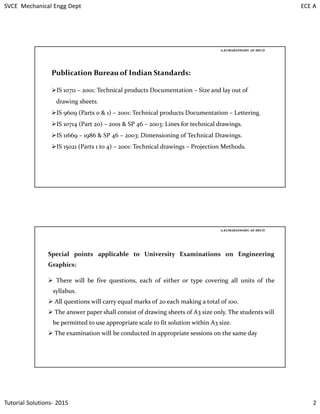 This document provides information about a course in engineering graphics including objectives, outcomes, topics covered, textbooks, and evaluation scheme. It includes details about the course code, credits, lecture and tutorial hours. The course aims to develop graphic skills for communication and design. It covers topics like curves, projection of points, lines, planes and solids, sections of solids, development of surfaces, isometric and perspective projections. Internal assessment and university examination process are also outlined.