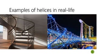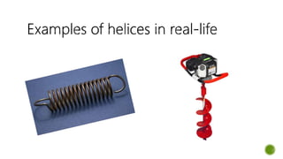 A helix is a curve formed by a point moving along a fixed straight line while revolving around a fixed axis in a plane perpendicular to the straight line. The document provides an example of drawing a basic helix with a 120mm pitch and 35mm radius by dividing a circle into 12 equal parts, projecting the pitch vertically from each part, and connecting the intersections to form the helix curve.