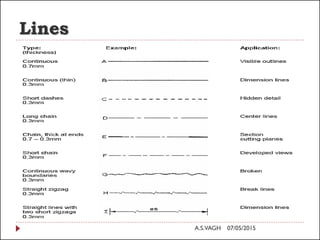 1) Types of lines used in technical drawings such as visible, hidden, center, and cutting plane lines.