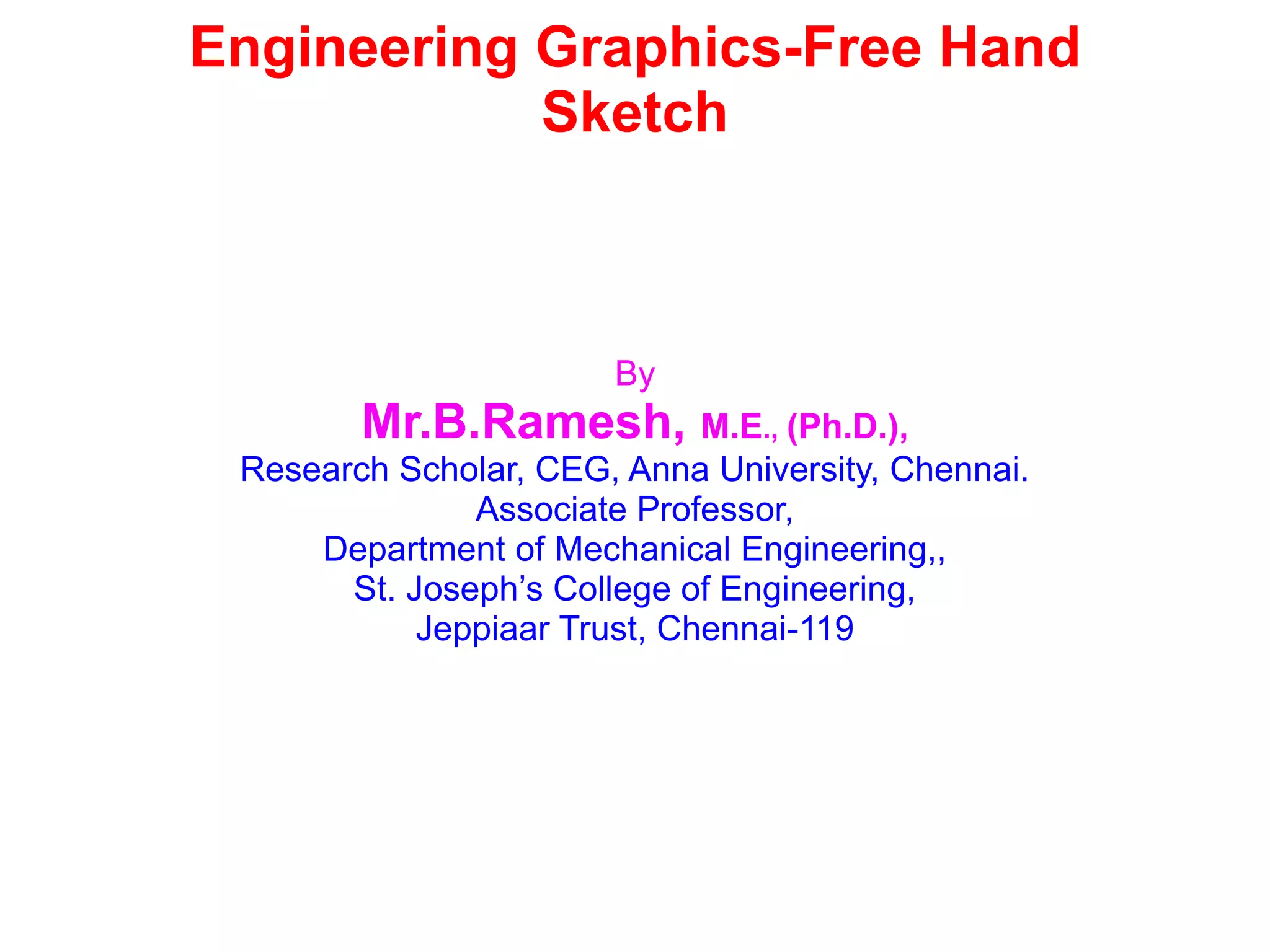 This document provides an overview of engineering graphics and free hand sketching. It discusses plane curves that are commonly used in engineering like conics, cycloids and involutes. It emphasizes the importance of developing visualization skills through free hand sketching of multiple views from pictorial representations of objects. Step-by-step procedures for sketching orthographic views from pictorial views using first angle projection are demonstrated through examples. The general procedure involves sketching outlines, visible and hidden lines with a light pencil and then darkening and labeling for the final views.