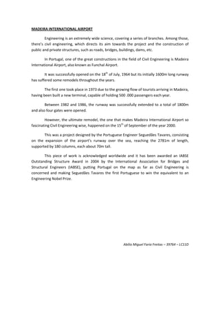 Madeira International Airport in Portugal is a major civil engineering project. The airport's runway has undergone several remodels and expansions since 1964 to accommodate growing passenger traffic. Most notably, in 2000 the runway was expanded over the sea supported by 180 columns up to 70 meters tall, reaching a length of 2781 meters. This innovative engineering feat was designed by Portuguese engineer Seguedães Tavares and received international recognition, winning the IABSE Outstanding Structure Award in 2004.