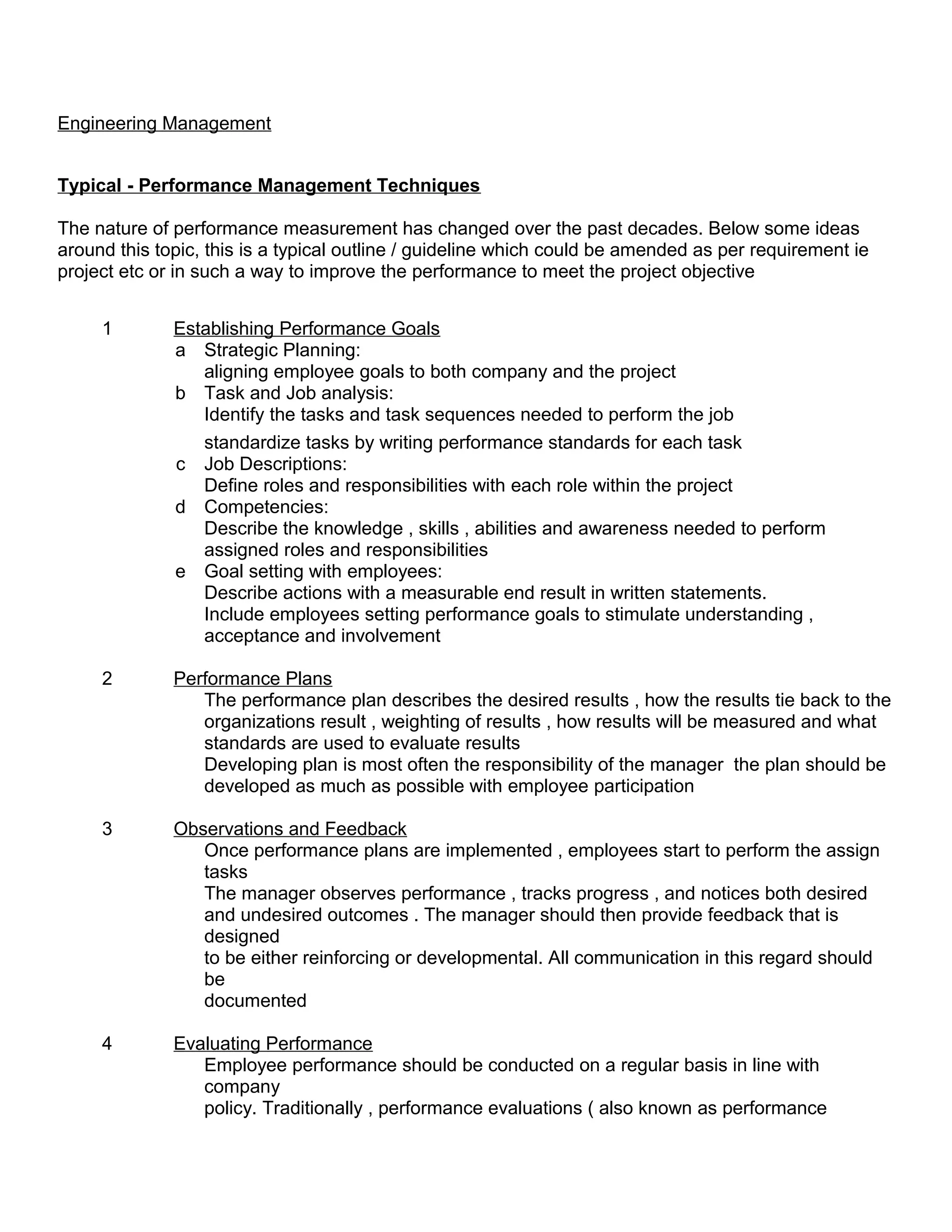 Performance management techniques in engineering management typically involve establishing performance goals, developing performance plans, and providing observations and feedback. Key aspects include aligning employee goals with company and project objectives, defining job descriptions and competencies, setting goals with employee involvement, developing performance plans with manager and employee input, regularly observing performance and providing reinforcing or developmental feedback, evaluating performance on a regular basis, rewarding performance that exceeds expectations, addressing performance problems, and creating performance development plans to improve deficiencies. The overall goal is to develop employees to meet expected performance levels.