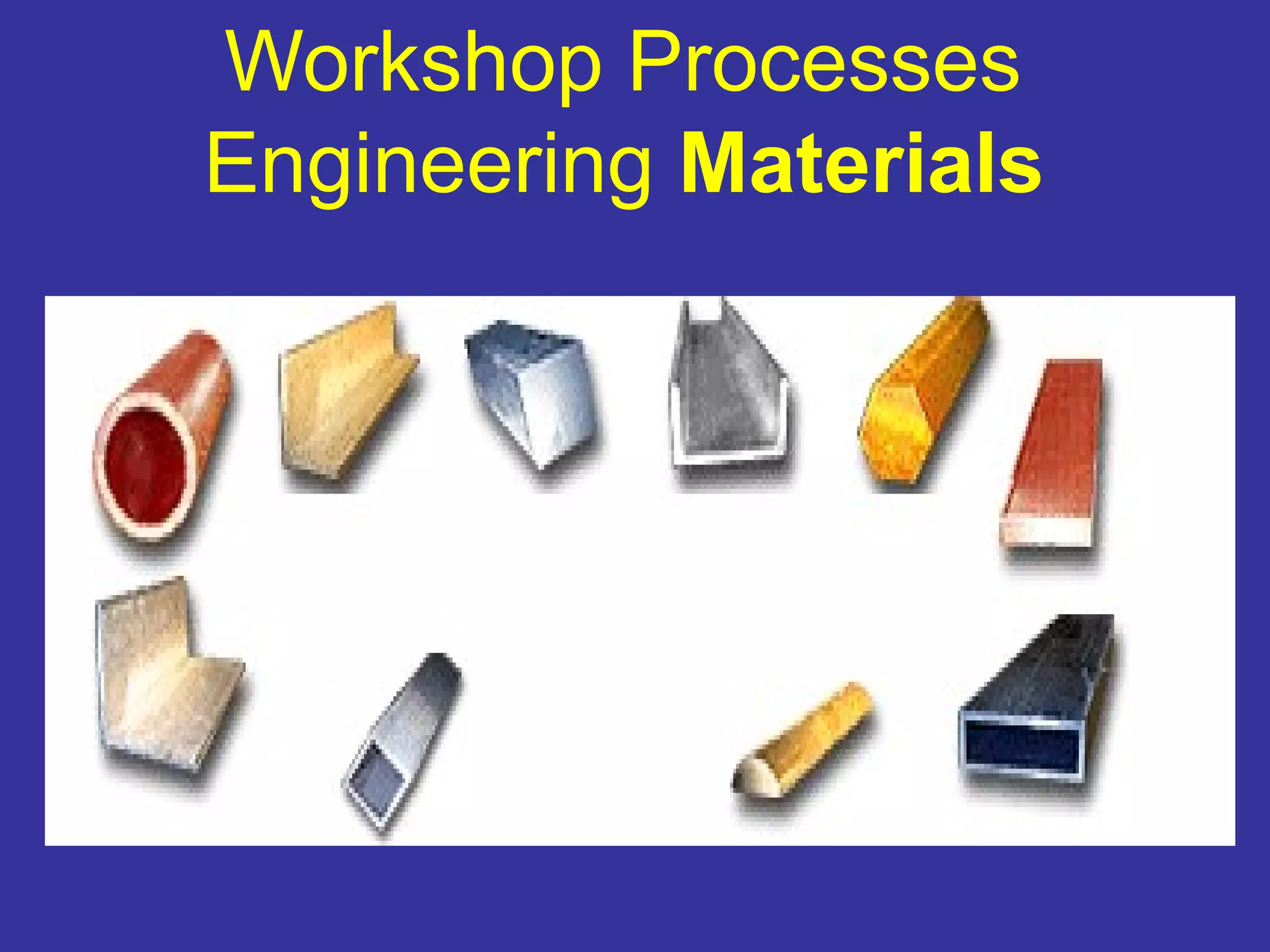 The document discusses various material properties including tensile strength, hardness, malleability, ductility, and brittleness. It then covers the classification of materials into ferrous materials like cast iron and various grades of steel, non-ferrous materials such as aluminum, copper, brass, tin, lead, and zinc, and non-metallic materials. For each material, the document outlines typical properties and common applications.